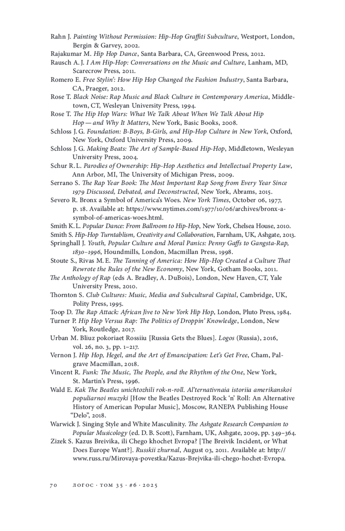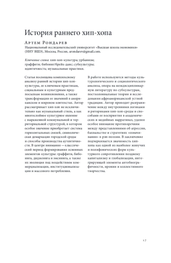 8. Хестанов Р. З. Хип-хоп: культура молодежной контрреволюции // Логос. 2016. Т. 26. № 4. С. 7-24. EDN: XAHIHT