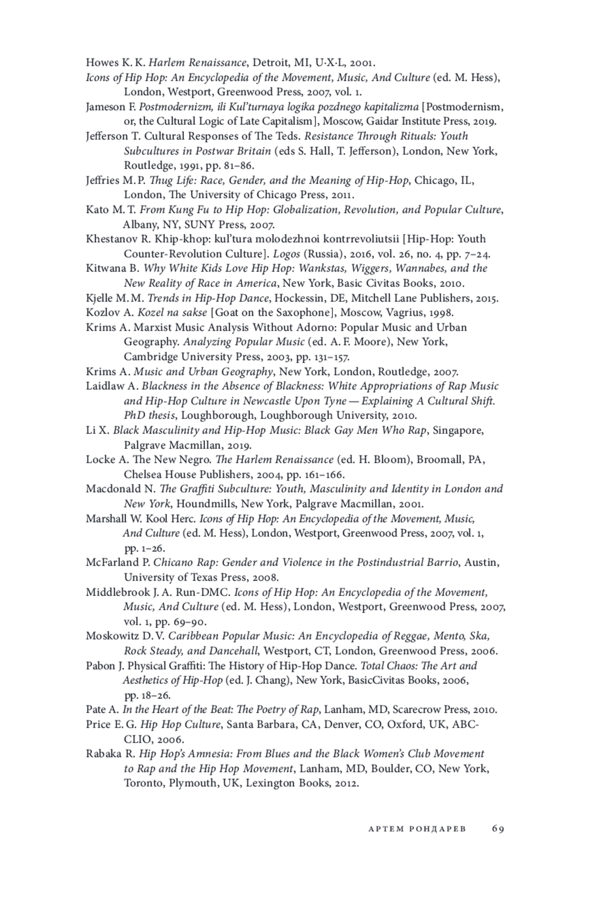 51. Laidlaw A. Blackness in the Absence of Blackness: White Appropriations of Rap Music and Hip-Hop Culture in Newcastle Upon Tyne - Explaining A Cultural Shift. PhD thesis. Loughborough: Loughborough University, 2010.