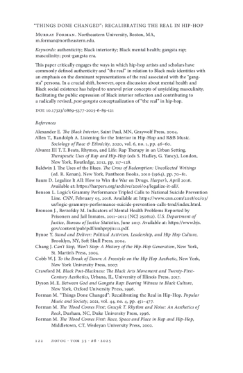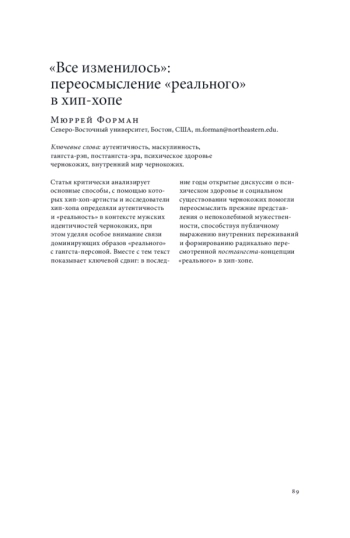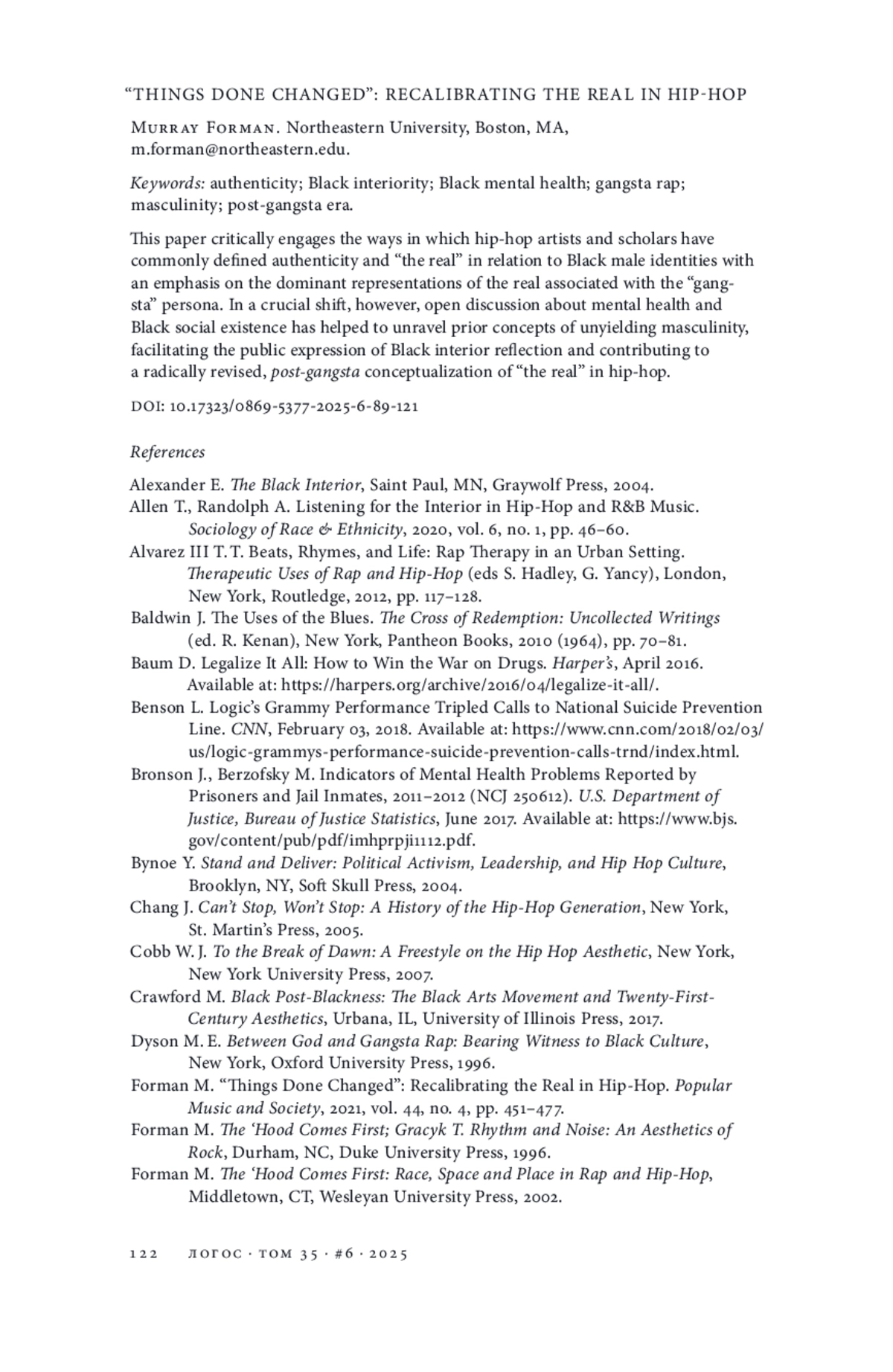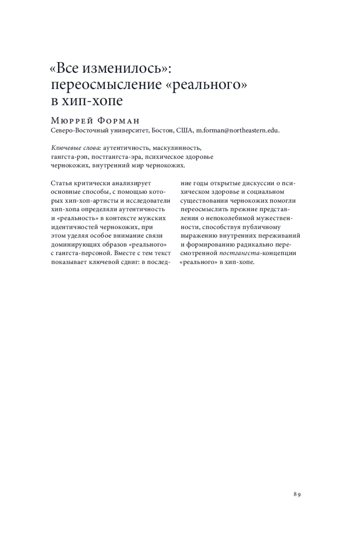 13. Forman M. “Things Done Changed”: Recalibrating the Real in Hip-Hop // Popular Music and Society. 2021. Vol. 44. № 4. P. 451-477. EDN: WRNSTD