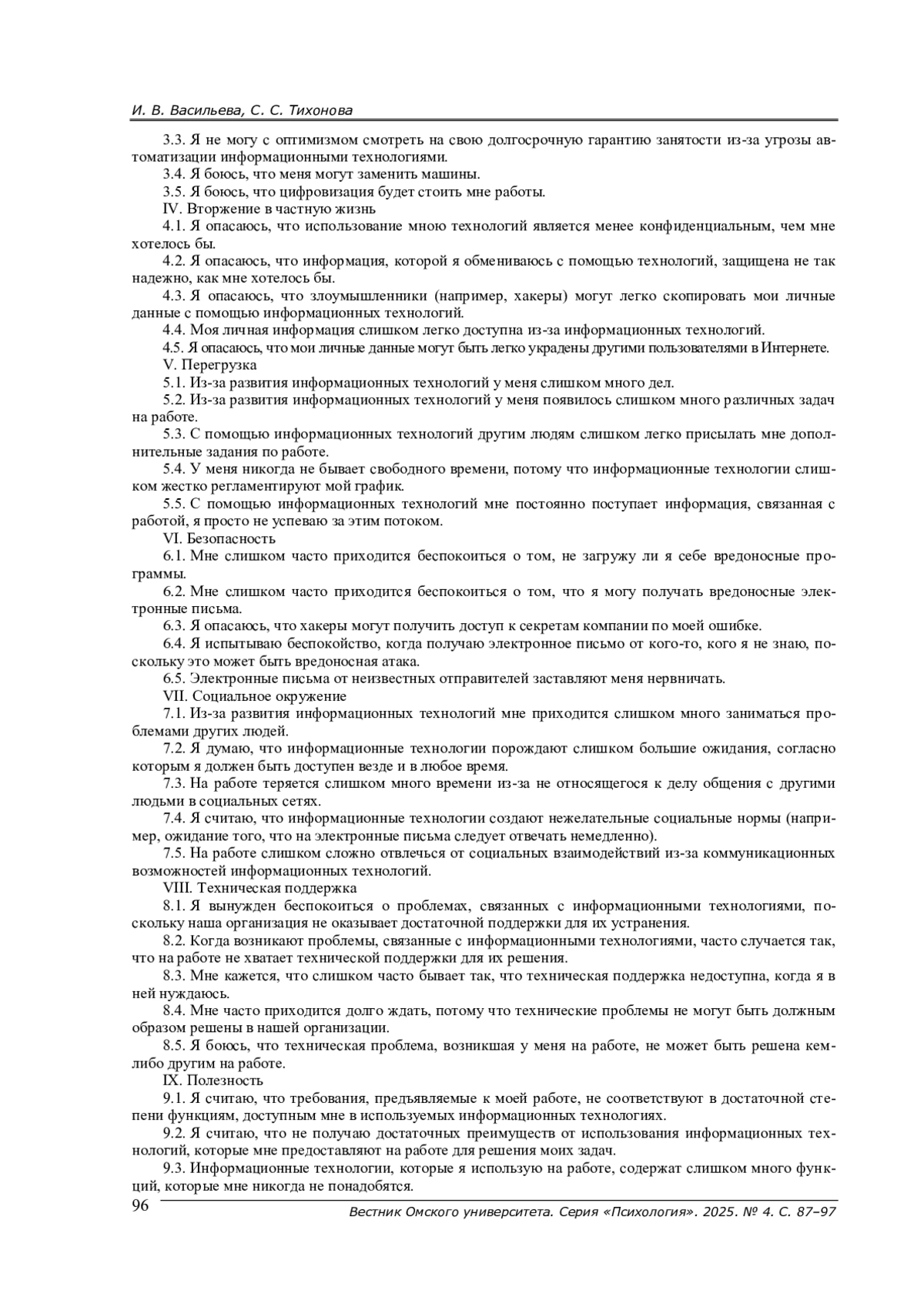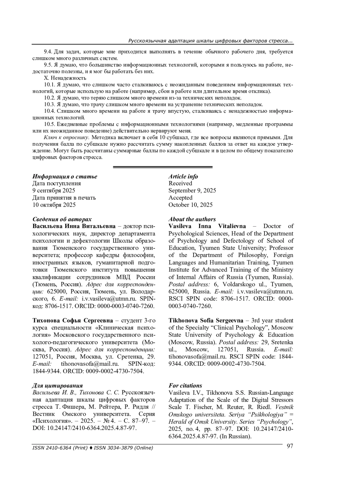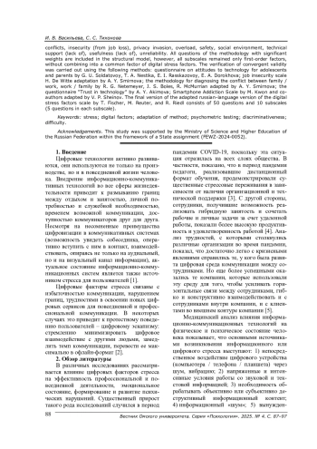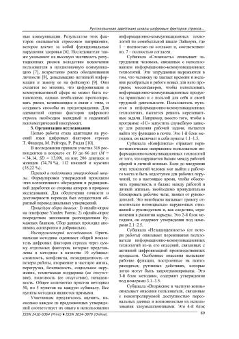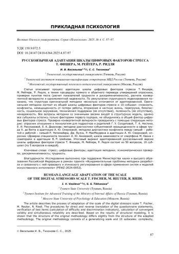 Статья описывает процесс адаптации шкалы цифровых факторов стресса Т. Фишера, М. Рейтера, Р. Ридля, а также процедуры прямого и обратного перевода утверждений опросника, проверки пунктов теста (расчет показателей трудности и дискриминативности), расчета конвергентной валидности и одномоментной надежности. По результатам структурного моделирования показано, что структура оригинальной методики несколько отличается от адаптированной. Оригинальная методика состоит из общей шкалы цифровых факторов стресса и 10 субшкал: сложность, конфликты, незащищенность от потери работы, вторжение в частную жизнь, перегрузка, безопасность, социальное окружение, техническая поддержка (ее отсутствие), полезность (ее отсутствие), ненадежность. Все вопросы методики со значимыми весами входят в структурную модель, однако все субшкалы остались только факторами первого порядка, не объединяясь в общий фактор цифровых факторов стресса. Проверка конвергентной валидности проводилась с помощью следующих методик: опросник отношения к технологиям для подростков и родителей Г. У. Солдатовой, Т. А. Нестика, Е. И. Рассказовой, Е. А. Дорохова; методика диагностики субъективной незащищенности в сфере труда Х. де Витта в адаптации А. Ю. Смирновой; методика диагностики конфликта между семьей - работой и работой - семьей Р. Нетемайера, Дж. Булса, Р. МакМюррена в адаптации А. Ю. Смирновой; опросник «Доверие специалиста технике» А. Ю. Акимовой; шкала зависимости от смартфона М. Квона с соавторами в адаптации В. П. Шейнова. Итоговый вариант адаптированной русскоязычной версии шкалы цифровых факторов стресса Т. Фишера, М. Рейтера, Р. Ридля состоит из 50 вопросов, 10 субшкал (по 5 вопросов в каждой).