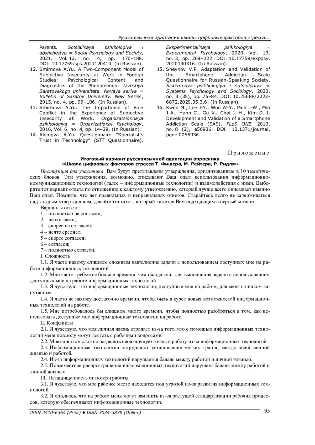 11. Солдатова Г. У., Нестик Т. А., Рассказова Е. И., Дорохов Е. А. Психодиагностика технофобии и технофилии: разработка и апробация опросника отношения к технологиям для подростков и родителей // Социальная психология и общество. - 2021. - Т. 12, № 4. - C. 170-188. - 10.177 59/sps.2021120410. DOI: 10.17759/sps.2021120410 EDN: YMIJOM