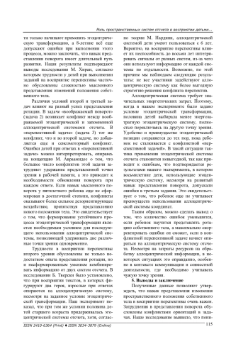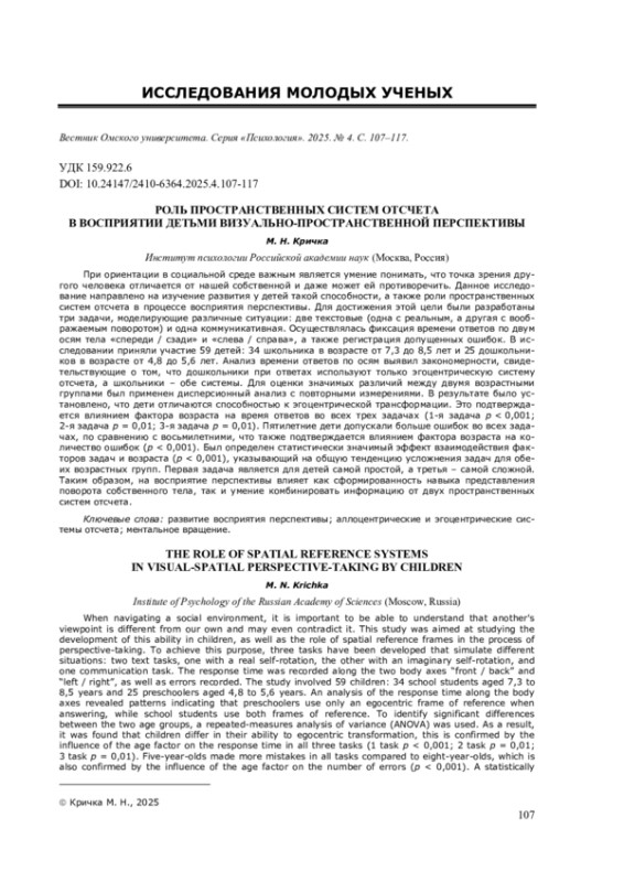 При ориентации в социальной среде важным является умение понимать, что точка зрения другого человека отличается от нашей собственной и даже может ей противоречить. Данное исследование направлено на изучение развития у детей такой способности, а также роли пространственных систем отсчета в процессе восприятия перспективы. Для достижения этой цели были разработаны три задачи, моделирующие различные ситуации: две текстовые (одна с реальным, а другая с воображаемым поворотом) и одна коммуникативная. Осуществлялась фиксация времени ответов по двум осям тела «спереди / сзади» и «слева / справа», а также регистрация допущенных ошибок. В исследовании приняли участие 59 детей: 34 школьника в возрасте от 7,3 до 8,5 лет и 25 дошкольников в возрасте от 4,8 до 5,6 лет. Анализ времени ответов по осям выявил закономерности, свидетельствующие о том, что дошкольники при ответах используют только эгоцентрическую систему отсчета, а школьники - обе системы. Для оценки значимых различий между двумя возрастными группами был применен дисперсионный анализ с повторными измерениями. В результате было установлено, что дети отличаются способностью к эгоцентрической трансформации. Это подтверждается влиянием фактора возраста на время ответов во всех трех задачах (1-я задача p < 0,001; 2-я задача p = 0,01; 3-я задача p = 0,01). Пятилетние дети допускали больше ошибок во всех задачах, по сравнению с восьмилетними, что также подтверждается влиянием фактора возраста на количество ошибок ( p < 0,001). Был определен статистически значимый эффект взаимодействия факторов задач и возраста ( p < 0,001), указывающий на общую тенденцию усложнения задач для обеих возрастных групп. Первая задача является для детей самой простой, а третья - самой сложной. Таким образом, на восприятие перспективы влияет как сформированность навыка представления поворота собственного тела, так и умение комбинировать информацию от двух пространственных систем отсчета.