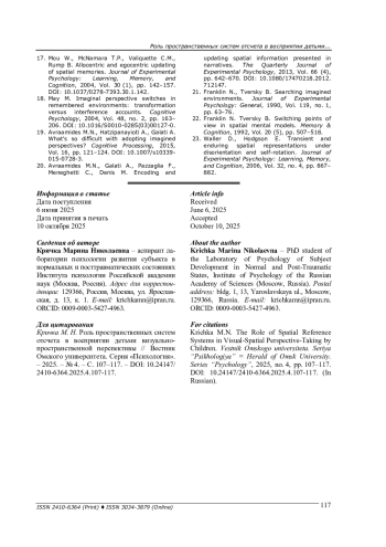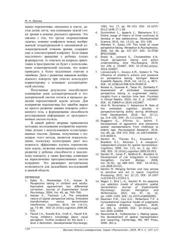 19. Avraamides M.N., Hatzipanayioti A., Galati A. What’s so difficult with adopting imagined perspectives? Cognitive Processing, 2015, Vol. 16, pp. 121-124. DOI: 10.1007/s10339-015-0728-3 EDN: SCUTJX