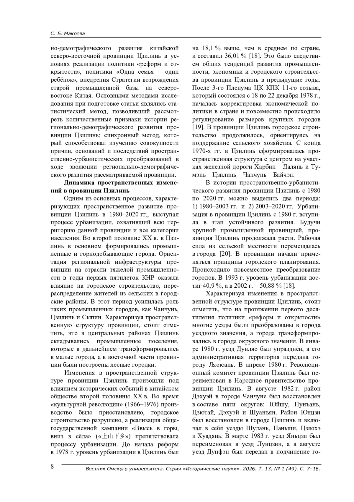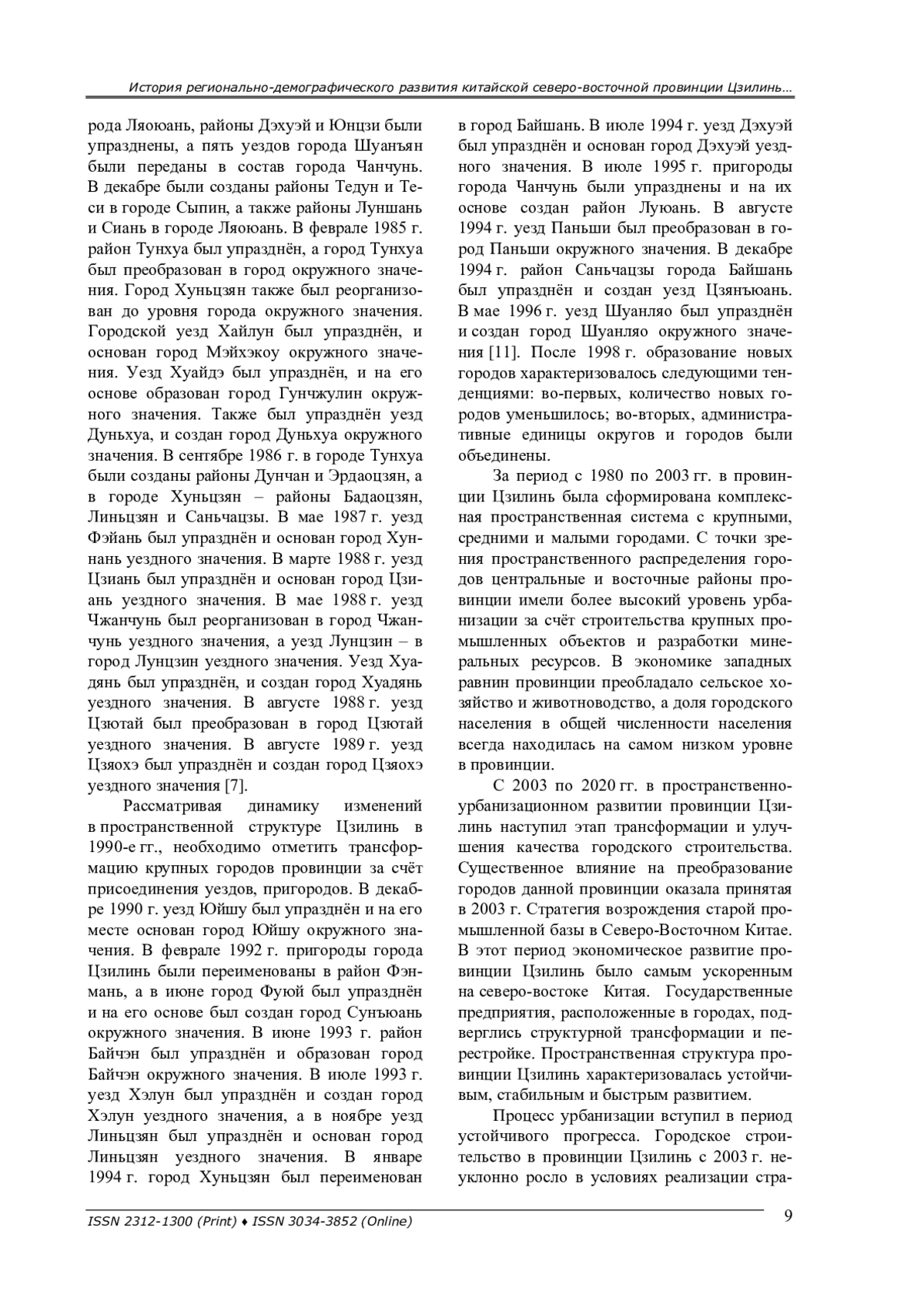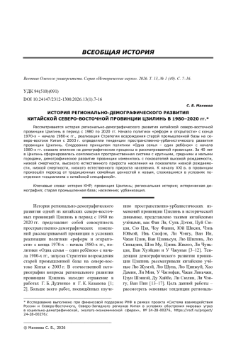 Рассматривается история регионально-демографического развития китайской северо-восточной провинции Цзилинь в период с 1980 по 2020 гг. Начало политики «реформ и открытости» с конца 1970-х - начала 1980-х гг., реализация Стратегии возрождения старой промышленной базы на северо-востоке Китая с 2003 г. определяли тенденции пространственно-урбанистического развития провинции Цзилинь. Следование принципам политики «Одна семья - один ребёнок» с начала 1980-х гг. оказало влияние на демографические процессы в рассматриваемой провинции. За 40 лет в Цзилинь сформировалась комплексная пространственная система с крупными, средними и малыми городами, демографическое развитие провинции изменилось с показателей высокой рождаемости, низкой смертности, высокого естественного прироста населения на показатели низкой рождаемости, низкой смертности, низкого естественного прироста населения. К началу ХХI в. в провинции произошёл переход от традиционных семейных ценностей к новым, сложившимся в условиях построения «социализма с китайской спецификой».