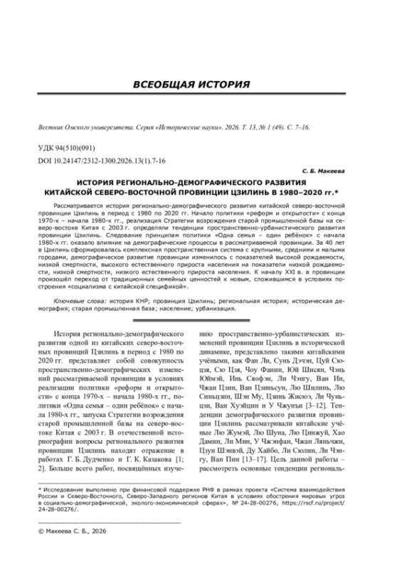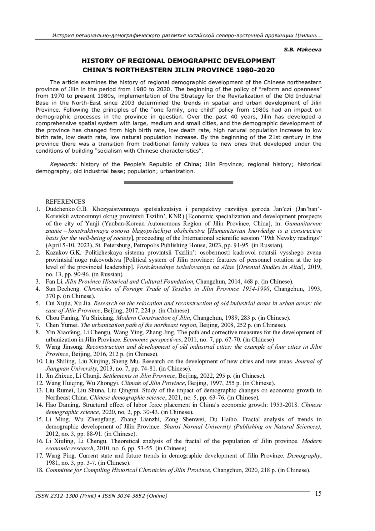 История регионально-демографического развития одной из китайских северо-восточных провинций Цзилинь в период с 1980 по 2020 гг. представляет собой совокупность пространственно-демографических изменений рассматриваемой провинции в условиях реализации политики «реформ и открытости» с конца 1970-х – начала 1980-х гг., политики «Одна семья – один ребёнок» с начала 1980-х гг., запуска Стратегии возрождения старой промышленной базы на северо-востоке Китая с 2003 г.