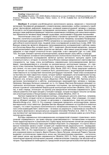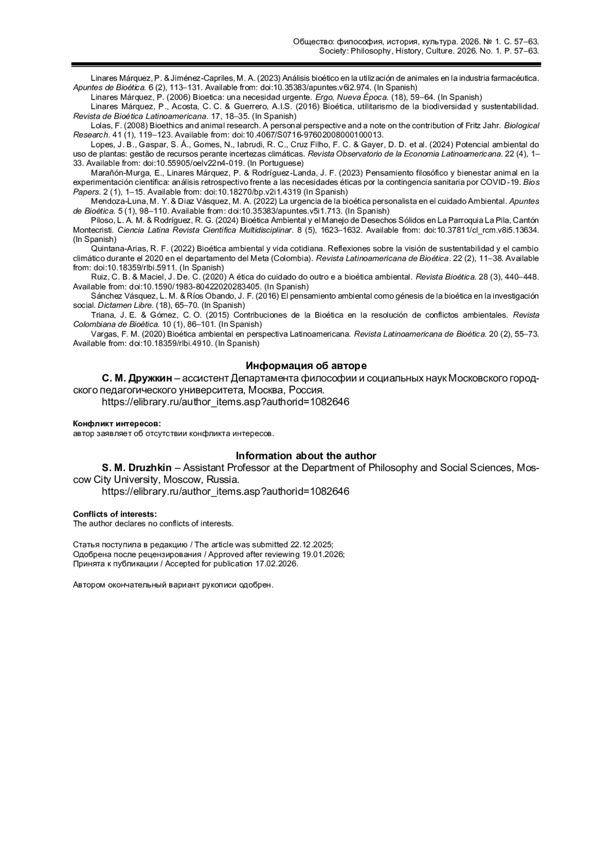 23. Vargas F. M. Bioética ambiental en perspectiva Latinoamericana // Revista Latinoamericana de Bioética. 2020. Vol. 20, no. 2. P. 55-73. (на исп. яз.). DOI: 10.18359/rlbi.4910 EDN: QGATAP