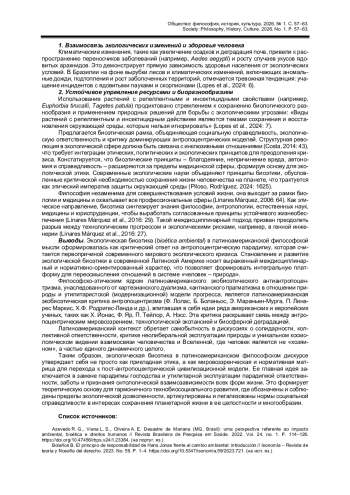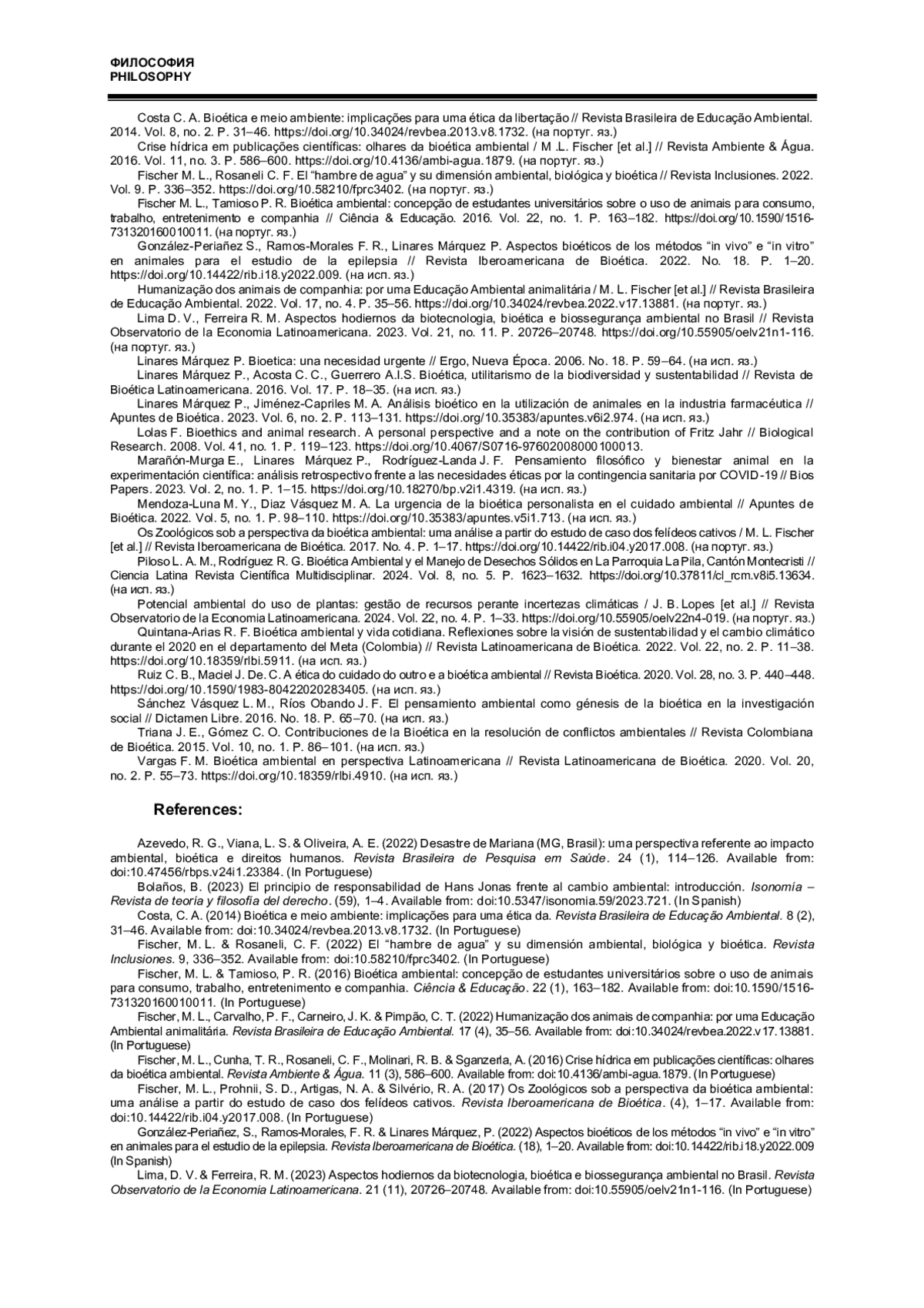 3. Costa C. A. Bioética e meio ambiente: implicações para uma ética da libertação // Revista Brasileira de Educação Ambiental. 2014. Vol. 8, no. 2. P. 31-46. (на португ. яз.). DOI: 10.34024/revbea.2013.v8.1732