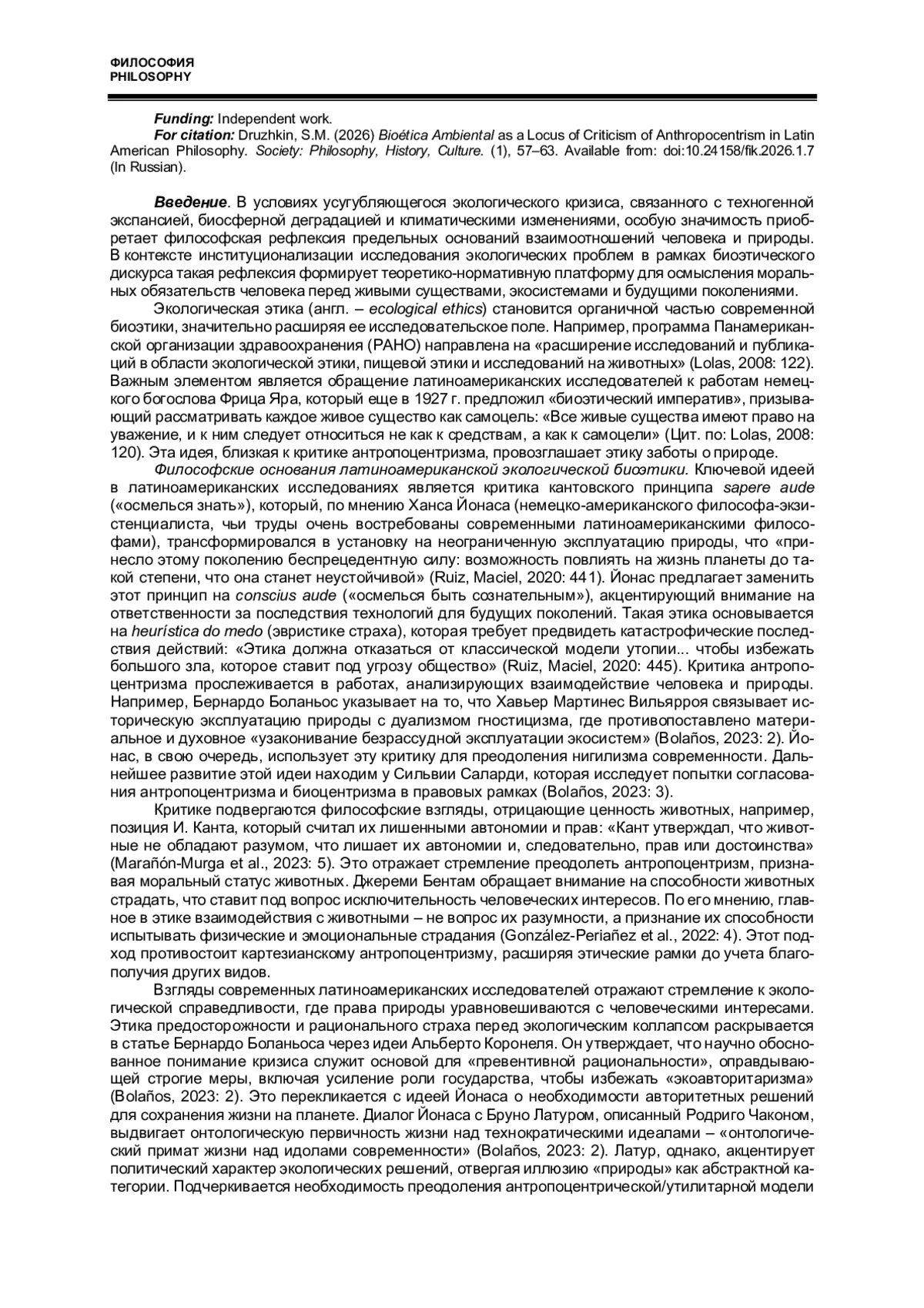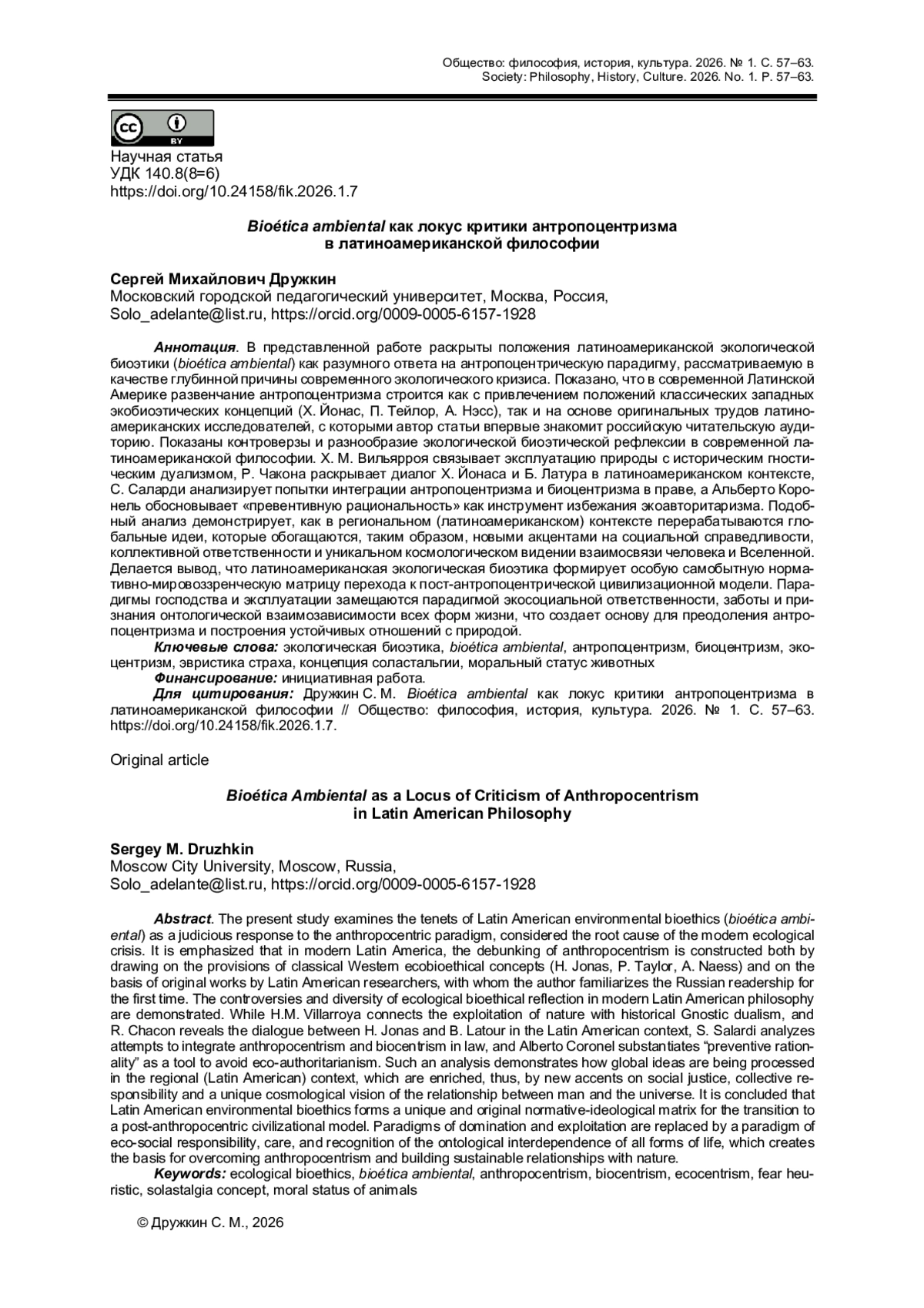 В представленной работе раскрыты положения латиноамериканской экологической биоэтики ( bioética ambiental ) как разумного ответа на антропоцентрическую парадигму, рассматриваемую в качестве глубинной причины современного экологического кризиса. Показано, что в современной Латинской Америке развенчание антропоцентризма строится как с привлечением положений классических западных экобиоэтических концепций (Х. Йонас, П. Тейлор, А. Нэсс), так и на основе оригинальных трудов латиноамериканских исследователей, с которыми автор статьи впервые знакомит российскую читательскую аудиторию. Показаны контроверзы и разнообразие экологической биоэтической рефлексии в современной латиноамериканской философии. Х. М. Вильярроя связывает эксплуатацию природы с историческим гностическим дуализмом, Р. Чакона раскрывает диалог Х. Йонаса и Б. Латура в латиноамериканском контексте, С. Саларди анализирует попытки интеграции антропоцентризма и биоцентризма в праве, а Альберто Коронель обосновывает «превентивную рациональность» как инструмент избежания экоавторитаризма. Подобный анализ демонстрирует, как в региональном (латиноамериканском) контексте перерабатываются глобальные идеи, которые обогащаются, таким образом, новыми акцентами на социальной справедливости, коллективной ответственности и уникальном космологическом видении взаимосвязи человека и Вселенной.