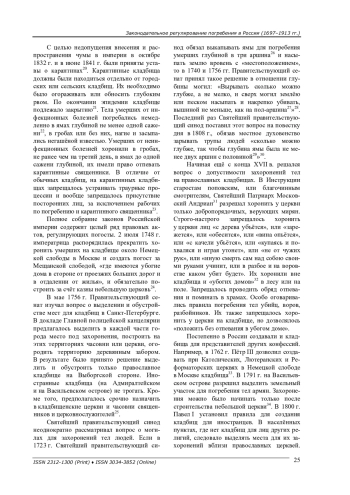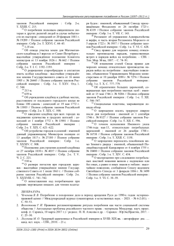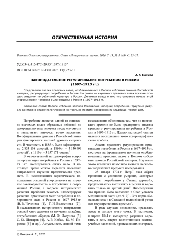 Представлен анализ правовых актов, опубликованных в Полном собрании законов Российской империи, регулирующих погребение в России. На ранее не изученных правовых актах показан процесс создания погребальной культуры в России. Делается вывод о том, что основные начала этой стороны жизни человека были созданы в России в 1697-1913 гг.