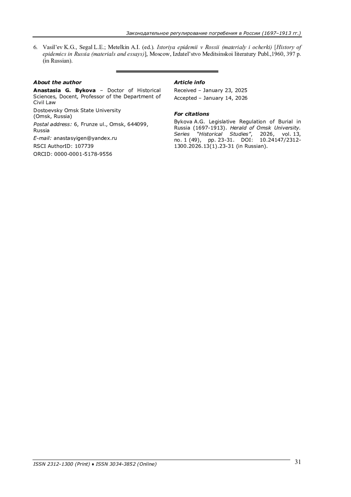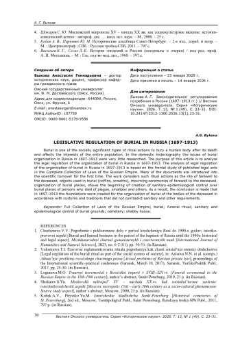 1. Чеченева В. В. Погребение и похоронное дело в период крещения Руси до 1990-х годов: историко-правовой аспект // Международный журнал гуманитарных и естественных наук. - 2023. - № 6-2 (81). - С. 50-53.