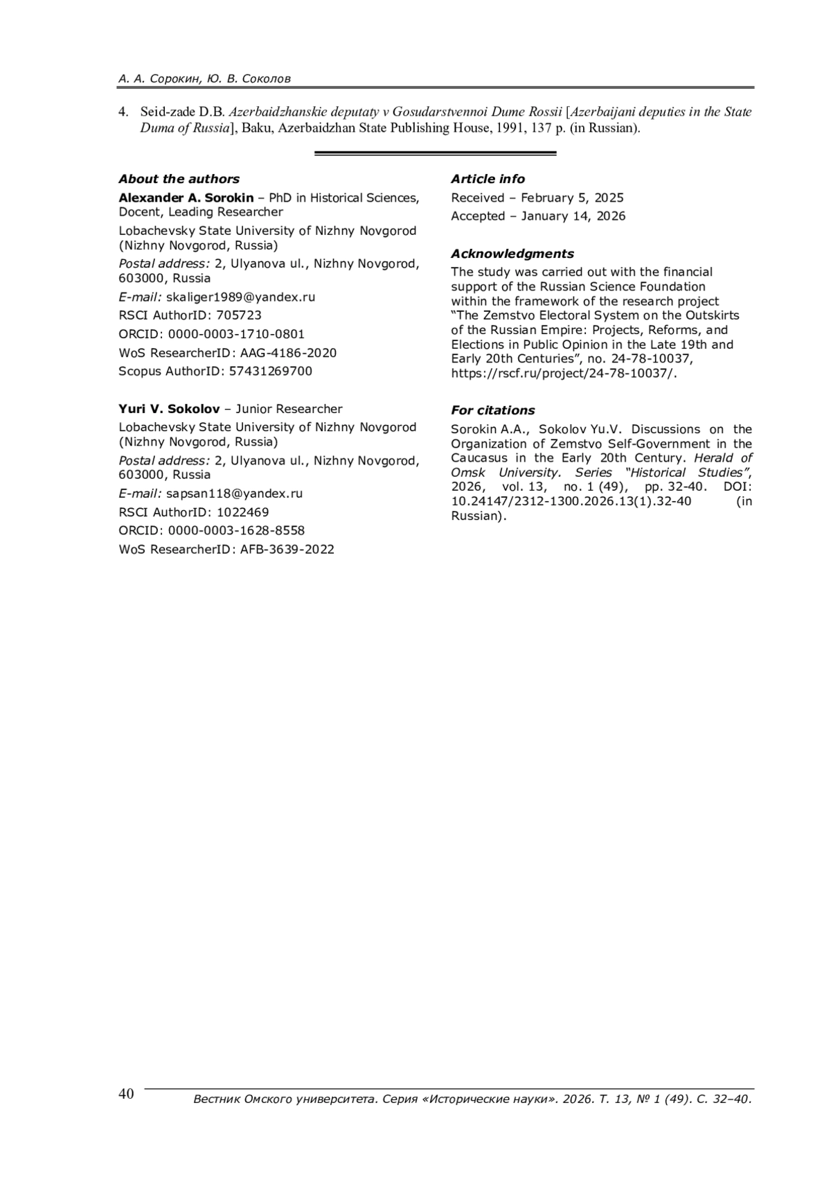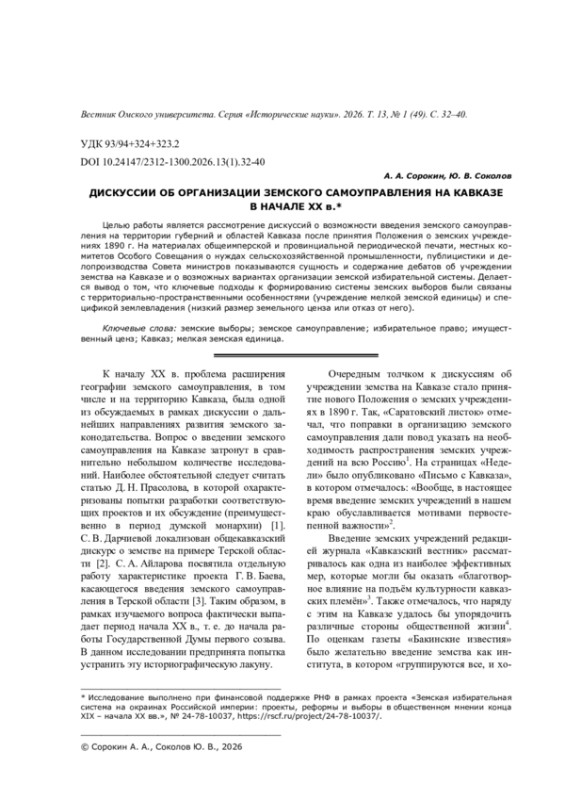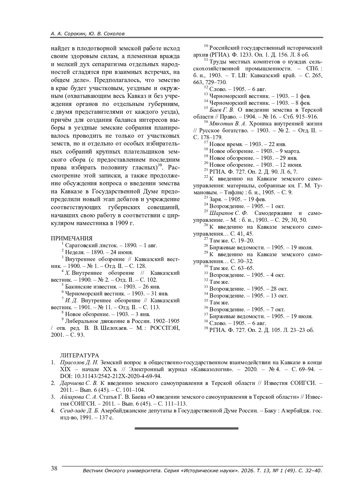 1. Прасолов Д. Н. Земский вопрос в общественно-государственном взаимодействии на Кавказе в конце XIX - начале XX в. // Электронный журнал “Кавказология”. - 2020. - № 4. - С. 69-94. -. DOI: 10.31143/2542-212X-2020-4-69-94