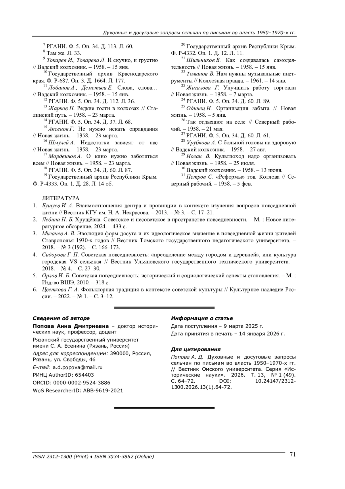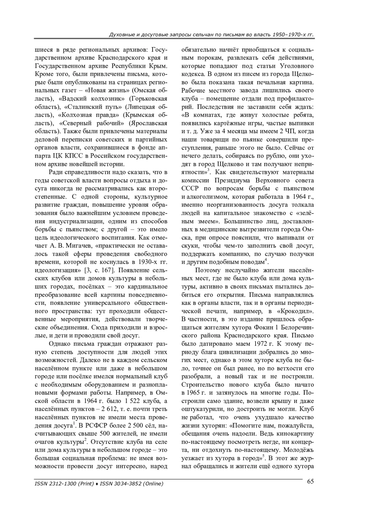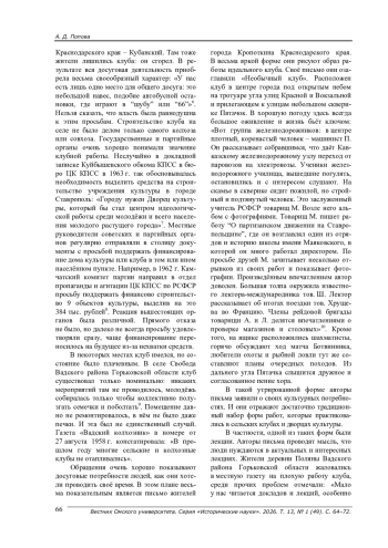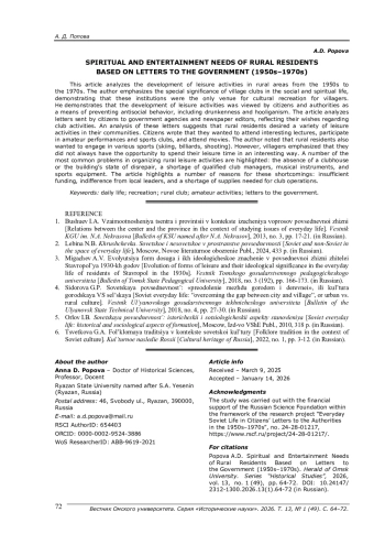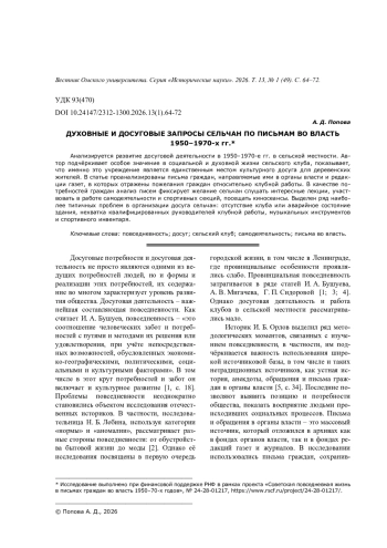 Анализируется развитие досуговой деятельности в 1950-1970-е гг. в сельской местности. Автор подчёркивает особое значение в социальной и духовной жизни сельского клуба, показывает, что именно это учреждение является единственным местом культурного досуга для деревенских жителей. В статье проанализированы письма граждан, направляемые ими в органы власти и редакции газет, в которых отражены пожелания граждан относительно клубной работы. В качестве потребностей граждан анализ писем фиксирует желание сельчан слушать интересные лекции, участвовать в работе самодеятельности и спортивных секций, посещать киносеансы. Выделен ряд наиболее типичных проблем в организации досуга сельчан: отсутствие клуба или аварийное состояние здания, нехватка квалифицированных руководителей клубной работы, музыкальных инструментов и спортивного инвентаря.