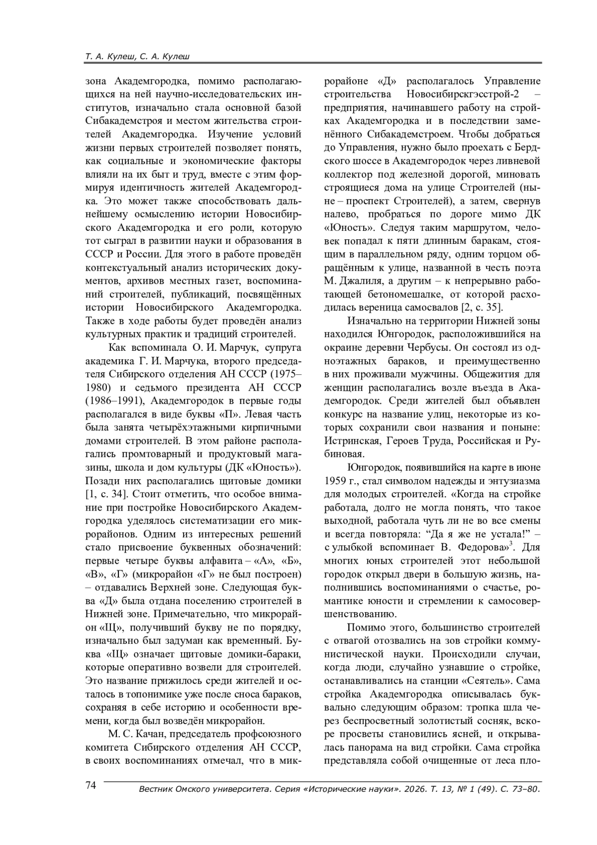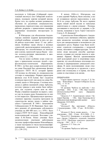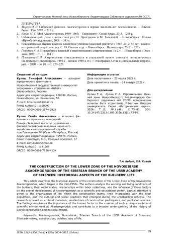 Рассматриваются исторические аспекты строительства Нижней зоны Новосибирского Академгородка, которое началось в середине 1950-х гг. Авторы анализируют условия труда и быта строителей, их социальный статус, отношения внутри трудовых коллективов и влияние этих факторов на общее развитие Академгородка как научного и образовательного центра. Особое внимание уделяется особенностям организации жизни строительных бригад, их взаимоотношению с местным населением, а также культурным и социальным практикам, сложившимся в ходе строительства. Исследование основано на архивных материалах, воспоминаниях участников строительства и опубликованных источниках. Результаты работы подчёркивают важность человеческого фактора в процессе создания такой уникальной социальной и научной среды, как Академгородок, и вносят вклад в более широкое понимание истории советского строительства и его социальной модели.