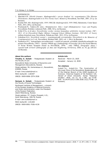 6. Пушкарева Н. Л. Антропология повседневности в социальной памяти советских женщин-ученых (на примере Новосибирска, 1950-е - начало 1990-х гг.) // Этнография Алтая и сопредельных территорий. - 2020. - № 10. - С. 220-223.