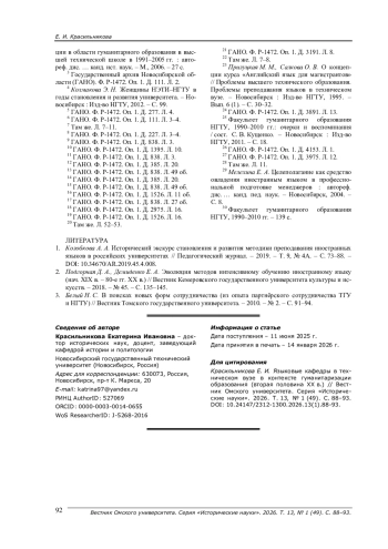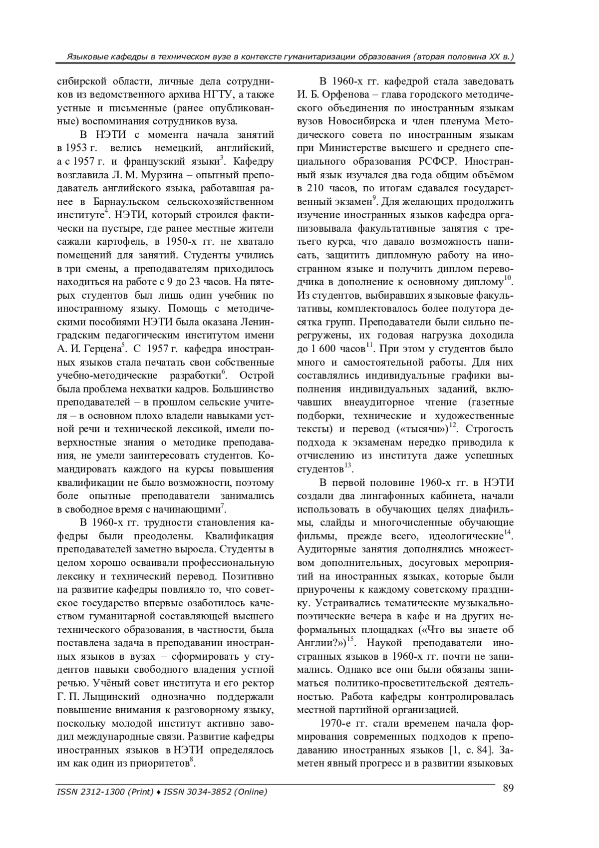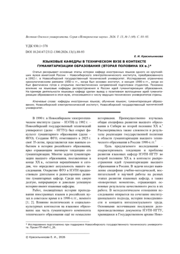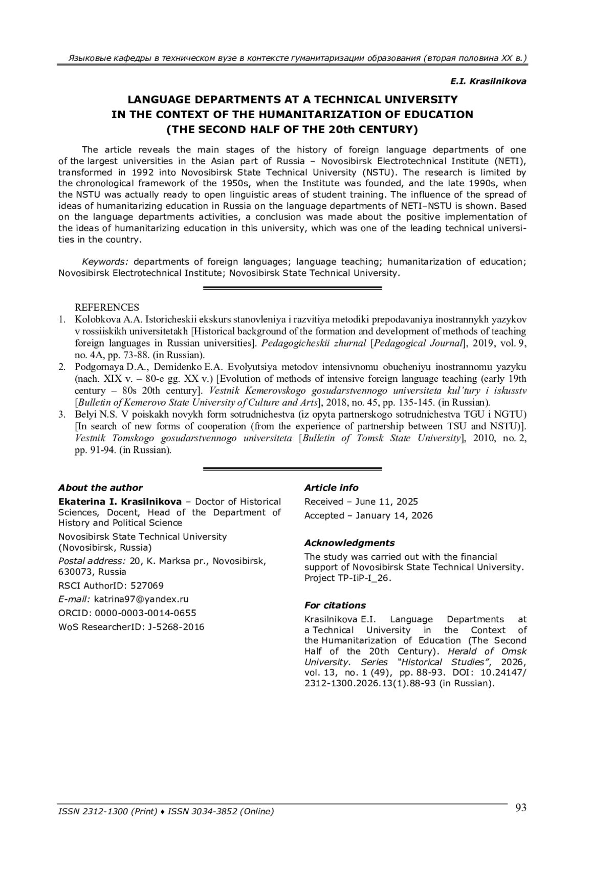 В 1990 г. в Новосибирском электротехническом институте (далее – НЭТИ) (с 1992 г. – Новосибирский государственный технический университет (далее – НГТУ)) был открыт факультет гуманитарного образования (далее – ФГО). Создание ФГО, отметившего в 2025 г. своё 35-летие, представляется нам важным событием в истории российского образования, ярко отражающим значимую тенденцию его гуманитаризации. Многие задачи гуманитаризации высшего образования, поставленные в конце ХХ в., остаются нерешёнными и сегодня, что определяет актуальность нашего исследования. Открытию ФГО в НЭТИ предшествовало длительное и разностороннее развитие гуманитарных кафедр. Среди них самую долгую, непрерывную и довольно успешную историю имеют языковые кафедры.