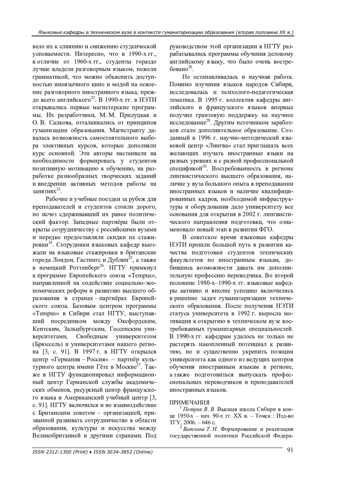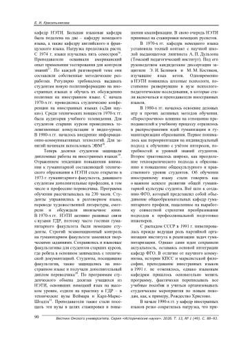 Статья раскрывает основные этапы истории кафедр иностранных языков одного из крупнейших вузов азиатской России - Новосибирского электротехнического института, преобразованного в 1992 г. в Новосибирский государственный технический университет. Исследование ограничено хронологическими рамками 1950-х гг., когда был основан институт, и концом 1990-х гг., когда он был фактически готов к открытию лингвистических направлений подготовки студентов. Показано влияние на языковые кафедры распространения в России идей гуманитаризации образования. На примере деятельности языковых кафедр сделан вывод о позитивном воплощении идей гуманитаризации образования в этом вузе, относившемся к числу ведущих технических университетов страны.
