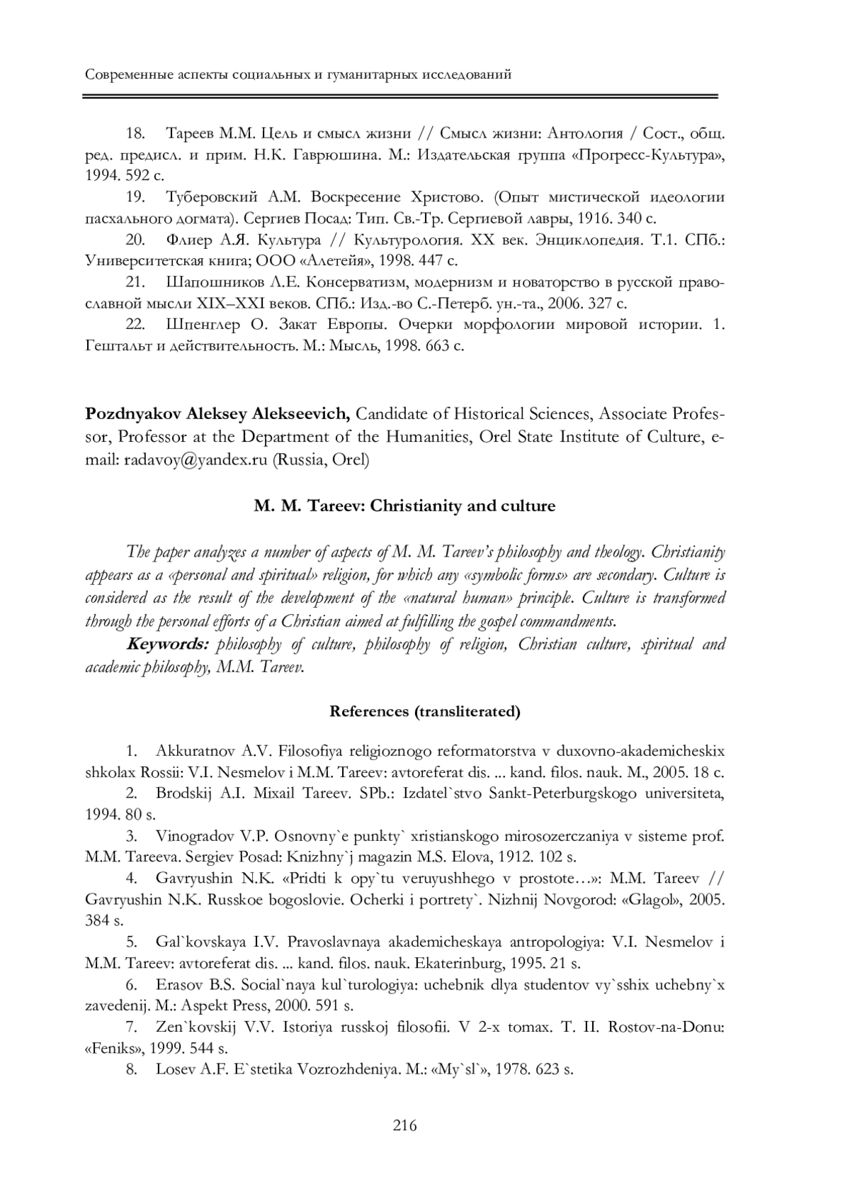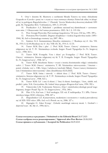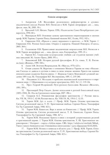 1. Аккуратнов А.В. Философия религиозного реформаторства в духовноакадемических школах России: В.И. Несмелов и М.М. Тареев: автореферат дис.. канд. филос. наук. М., 2005. 18 c. EDN: ZNQEFL