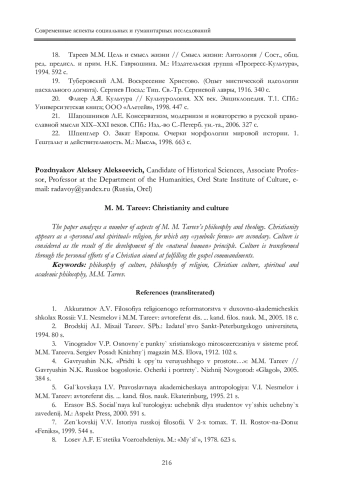 В данной статье автором анализируются отдельные аспекты философии и богословия М. М. Тареева. Христианство предстает как «лично-духовная» религия, для которой любые «символические формы» носят вторичный характер. Культура рассматривается как результат развития «естественно-человеческого» начала, преображаемая посредством личных усилий христианина направленных на исполнение евангельских заповедей.