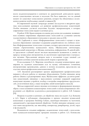 3. Загуменов А.П. Plugins. Запись и редактирование звука. Музыкальные эффекты. М.: НТ Пресс, 2005. 181 с. Образование и культурное пространство. № 2. 2025.