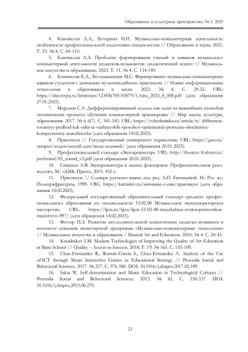 5. Коновалов А.А. Проблема формирования умений и навыков музыкальнокомпьютерной деятельности педагогов-музыкантов: дидактический аспект // Музыкальное искусство и образование. 2023. Т. 11. № 4. С. 134-149. EDN: LNOHKI
