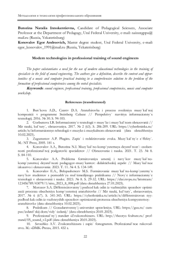 4. Коновалов А.А., Буторина Н.И. Музыкально-компьютерная деятельность: особенности профессиональной подготовки специалистов // Образование и наука. 2021. Т. 23. № 8. С. 84-110. EDN: CBXMOW