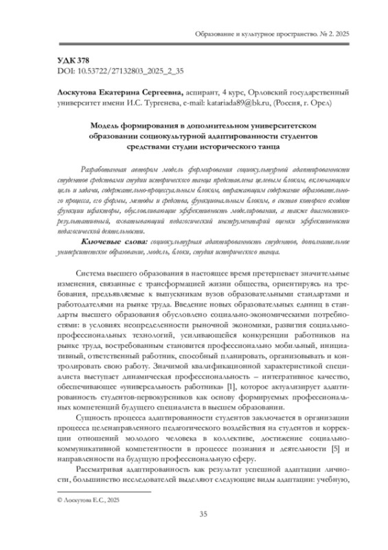 5. Ермакова А.А. Социально-культурная деятельность как средство адаптации первокурсников-выпускников сельских школ к условиям городского социума: автореф.дисс.. канд. пед. наук. Тамбов, 2010. 28 с. EDN: QHASIZ