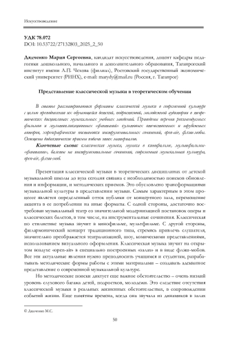 Презентация классической музыки в теоретических дисциплинах от детской музыкальной школы до вуза сегодня связана с необходимостью поисков обновления и информации, и методических приемов. Это обусловлено трансформациями музыкальной культуры в представлении музыки. Самым характерным в этом процессе является определенный отток публики от концертного зала, перемещение акцента в ее потреблении на иные форматы. С одной стороны, достаточно востребован музыкальный театр со значительной модернизацией постановок оперы и классических балетов, в том числе, на инструментальные сочинения. Классическая по стилистике музыка звучит в кинофильме, мультфильме. С другой стороны, филармонический концерт традиционного типа, стремясь привлечь слушателя, значительно преображается театрализацией, шоу, комическими представлениями, использованием визуального оформления. Классическая музыка звучит на открытом воздухе «open-air» в специально построенных «залах» и в виде флэш-мобов. Все эти актуальные явления нужно преподносить учащимся и студентам, разрабатывать методические формы работы с этими материалами – создавать адекватное представление о современной музыкальной культуре.