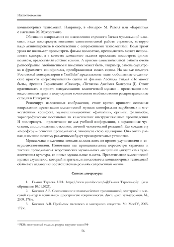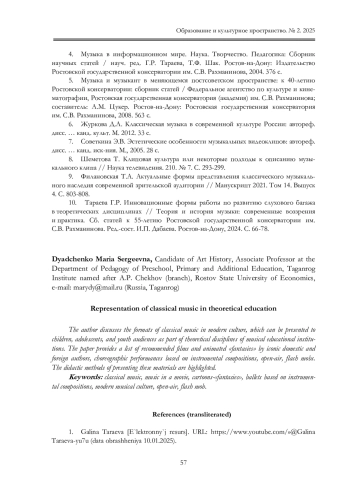 6. Журкова Д.А. Классическая музыка в современной культуре России: автореф. дисс. … канд. культ. М. 2012. 33 с. EDN: QHUXQR