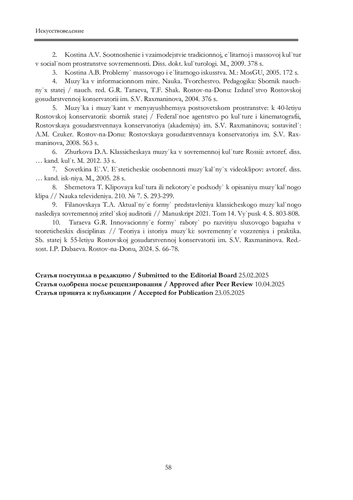 7. Советкина Э.В. Эстетические особенности музыкальных видеоклипов: автореф. дисс. … канд. иск-ния. М., 2005. 28 с. EDN: NIEKDV