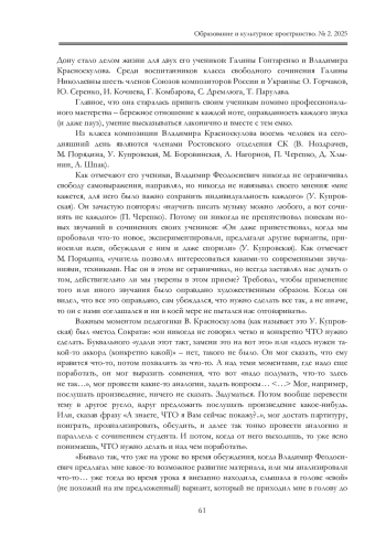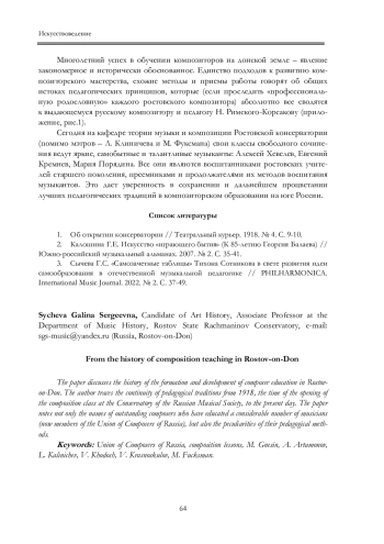 Профессиональное музыкальное образование в Ростове-на-Дону имеет богатую историю, длиной уже более 120 лет. Его становление и развитие связано с именами многих известных отечественных музыкантов, которые в разные годы работали в городе. Благодаря их труду, в Ростове сформировались крепкие педагогические традиции и самобытные исполнительские школы, воспитанников которых сегодня знают далеко за пределами нашей страны. Однако отдельного внимания заслуживает история преподавания композиции в Ростове-на-Дону. О наличии сложившихся здесь эффективных принципов обучения композиторскому мастерству, которые передаются из поколения в поколение, говорит тот факт, что Ростовское отделение Союза композиторов РФ (недавно отметившее 85-летний юбилей) – одно из самых многочисленных региональных объединений в России. И ежегодно список его участников пополняется новыми именами талантливых музыкантов, путь профессионального становления большинства из которых тесно связан со столицей региона. Проследить пути преемственности педагогических традиций в обучении композиторов на донской земле и является целью данной статьи.