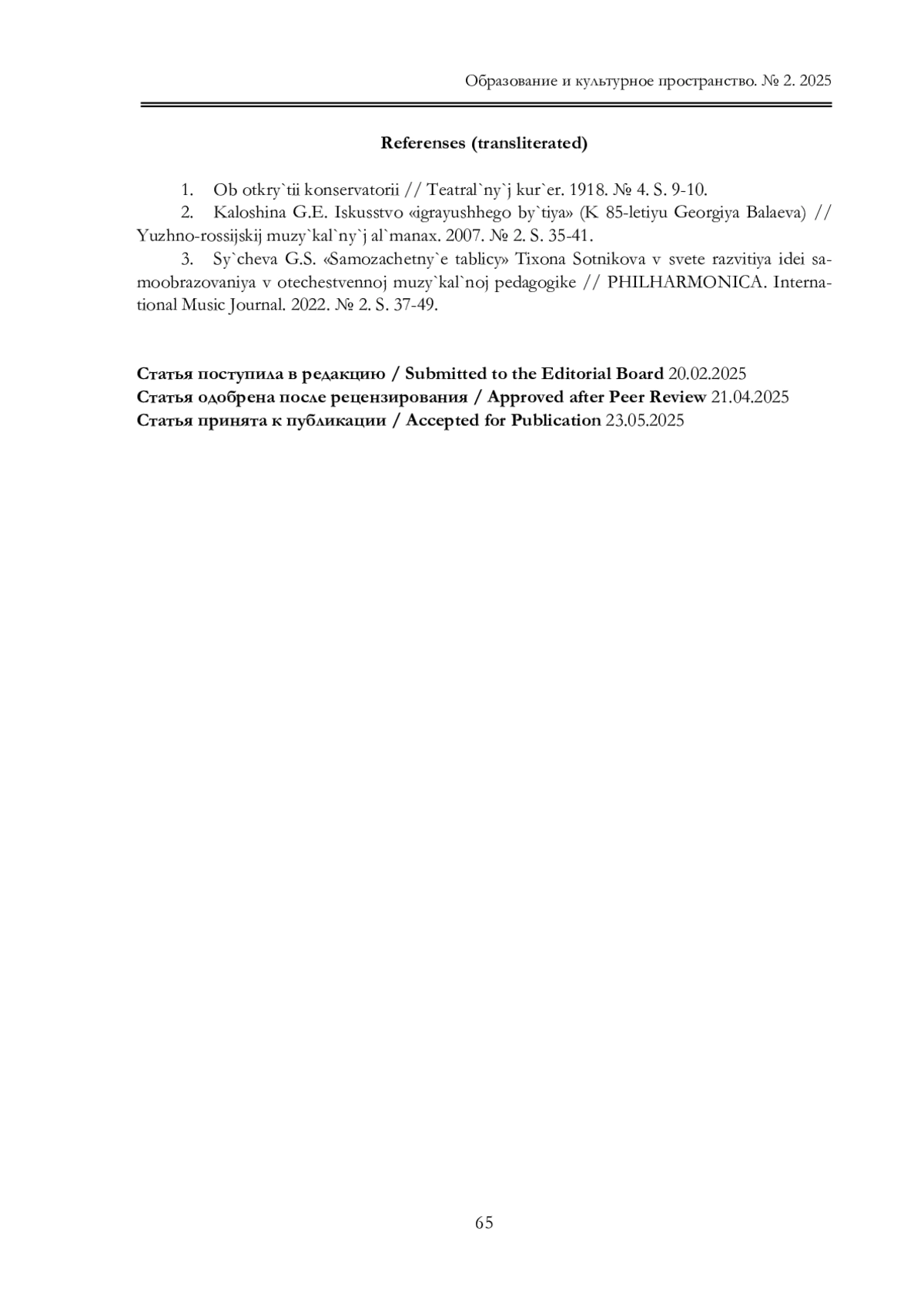 3. Сычева Г.С. “Самозачетные таблицы” Тихона Сотникова в свете развития идеи самообразования в отечественной музыкальной педагогике // PHILHARMONICA.International Music Journal. 2022. № 2. С. 37-49. EDN: NSXQNQ
