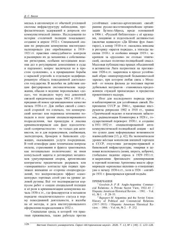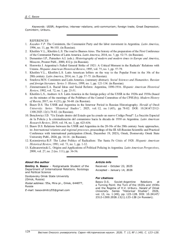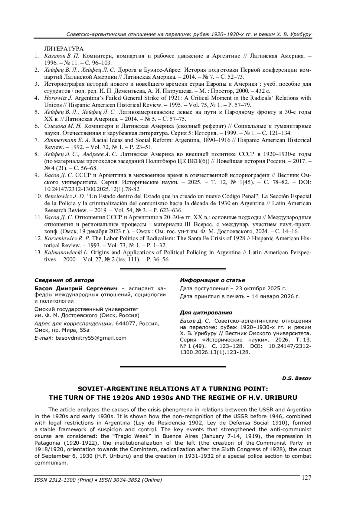9. Басов Д. С. СССР и Аргентина в межвоенное время в отечественной историографии // Вестник Омского университета. Серия: Исторические науки. - 2025. - Т. 12, № 1(45). - С. 78-82. -. DOI: 10.24147/2312-1300.2025.12(1).78-82