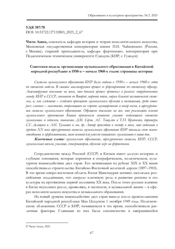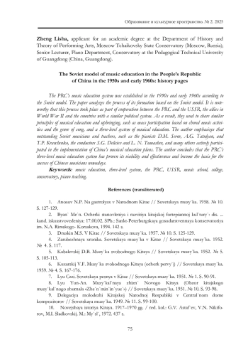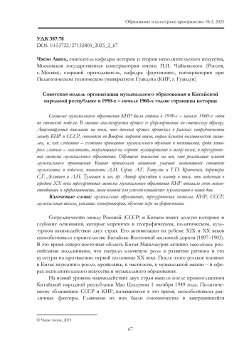 Система музыкального образования КНР была создана в 1950-е - начале 1960-х годов по советской модели. В статье анализируется процесс ее формирования по советскому образцу. Акцентируется внимание на том, что данный процесс протекал в рамках сотрудничества между КНР и СССР, союзников во Второй мировой войне, стран близкой политической системы, и, как следствие - сходство принципов музыкального обучения и воспитания, среди которых главные - массовость, опирающаяся на хоровое музицирование и жанр песни, и трехуровневая система музыкального образования. Обращено внимание на то, что реализации планов музыкального просвещения Китая принимали активное участие выдающиеся советские музыканты и педагоги, пианисты Д. М. Серов, А. Г. Татулян и Т. П. Кравченко, дирижеры С. Г. Делициев и Л. Н. Тумашев и мн. др. Автор приходит к выводу о том, что созданная в середине ХХ века трехуровневая система музыкального образования КНР показала свою жизнеспособность и эффективность, став основой для успехов китайских музыкантов в наши дни.