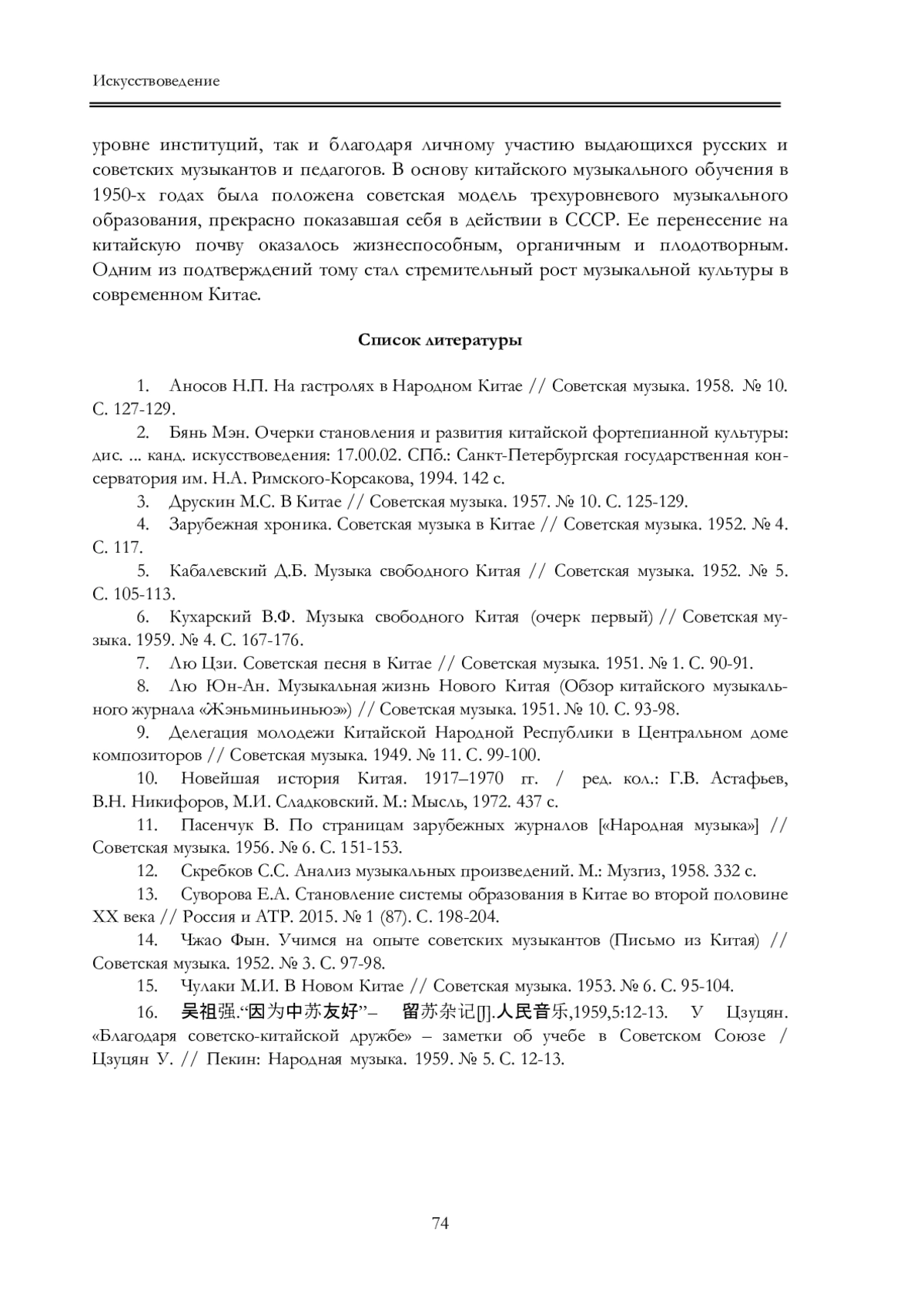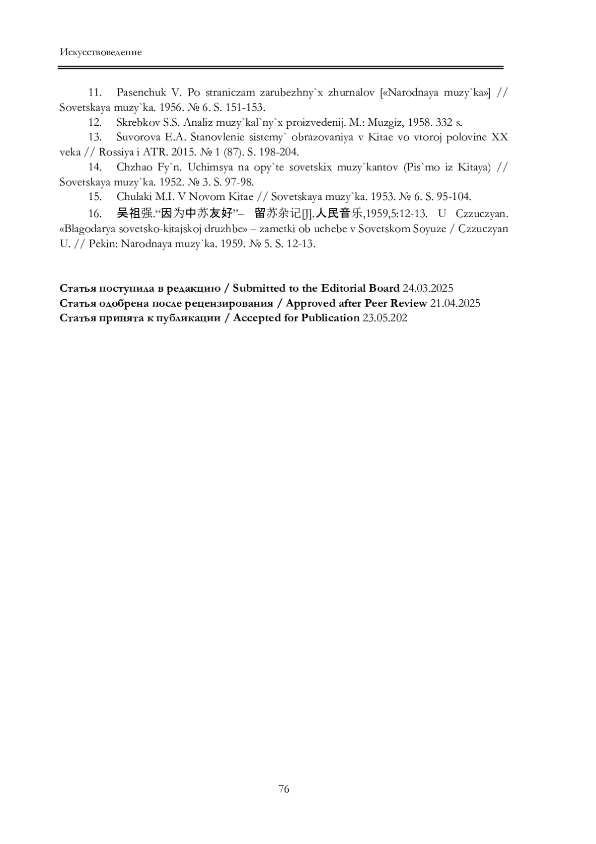 14. Чжао Фын. Учимся на опыте советских музыкантов (Письмо из Китая) // Советская музыка. 1952. № 3. С. 97-98.