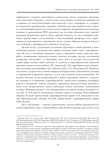 Песнопения демественного роспева редко звучит на клиросах Русской православной церкви (далее РПЦ). Причин тому несколько: ограниченность доступного современным певчим репертуара, неподготовленность клирошан и молящихся к восприятию стилистики древнерусского певческого искусства, отсутствие устойчивой исполнительской традиции. Как известно, демественный роспев после церковного раскола XVII в. продолжил свое развитие в среде «хранителей старой веры». Использование опыта старообрядческой певческой практики может быть полезно регентам хоров и певчим РПЦ, желающим украсить торжественные богослужения образцами этого стиля, а также руководителям светских хоровых коллективов. В статье на основе результатов исследований автора, его регентского опыта и интервью с головщиком Новосибирской общины Русской православной старообрядческой церкви А. Н. Емельяновым рассматриваются особенности работы с песнопениями демественного роспева.