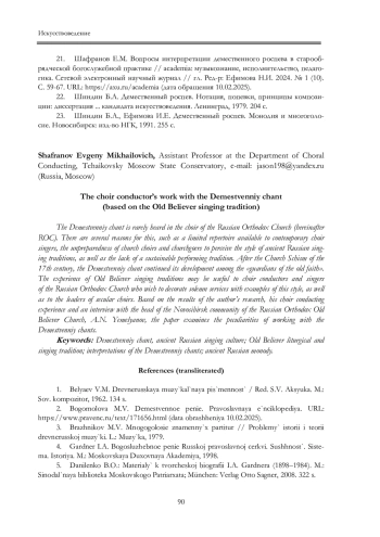 21. Шафранов Е.М. Вопросы интерпретации демественного роспева в старообрядческой богослужебной практике // academia: музыкознание, исполнительство, педагогика. Сетевой электронный научный журнал // гл. Ред-р: Ефимова Н.И. 2024. № 1 (10). С. 59-67. URL: https://axu.ru/academia (дата обращения 10.02.2025).