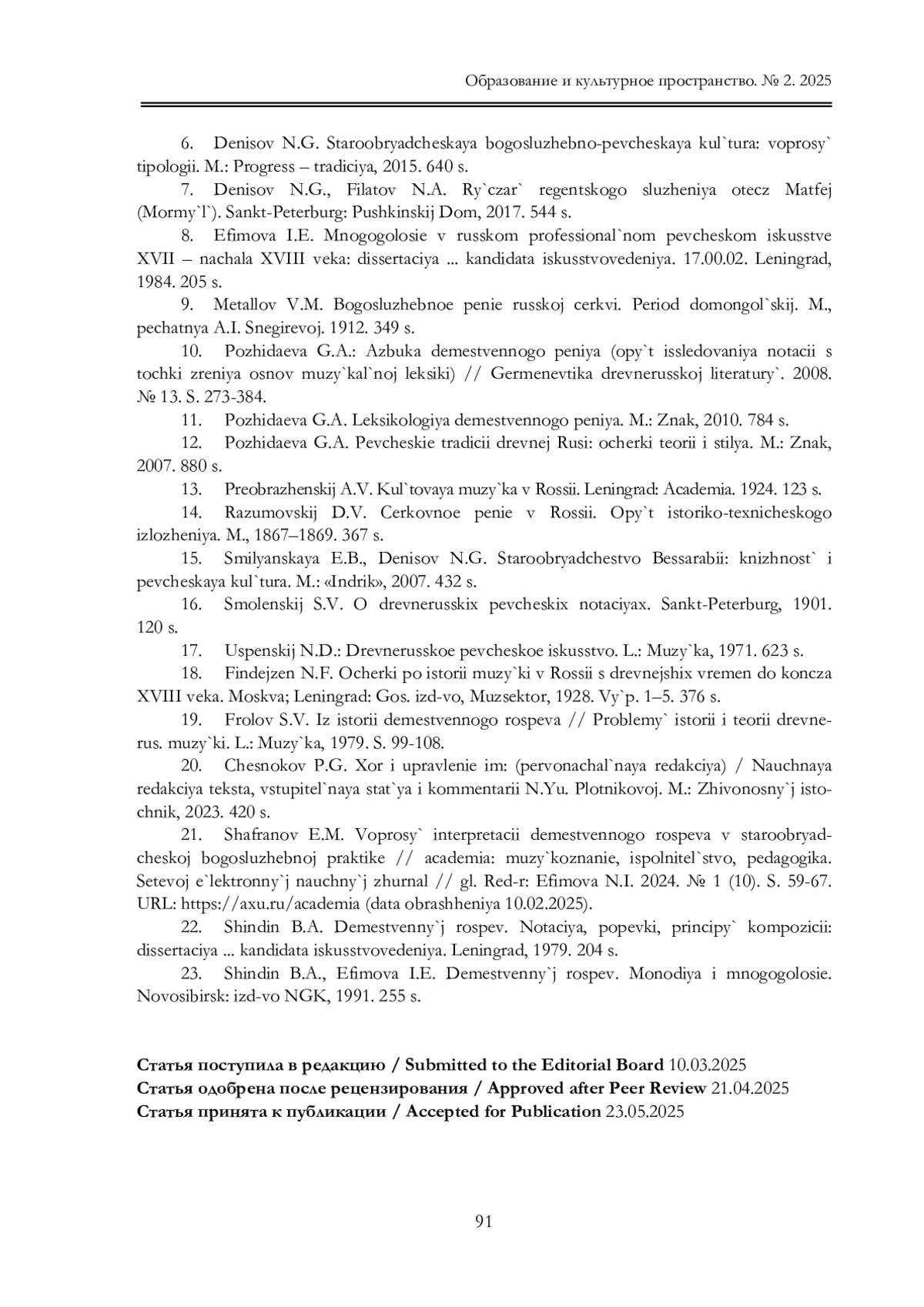6. Денисов Н.Г. Старообрядческая богослужебно-певческая культура: вопросы типологии. М.: Прогресс - традиция, 2015. 640 с. EDN: VRSIPP