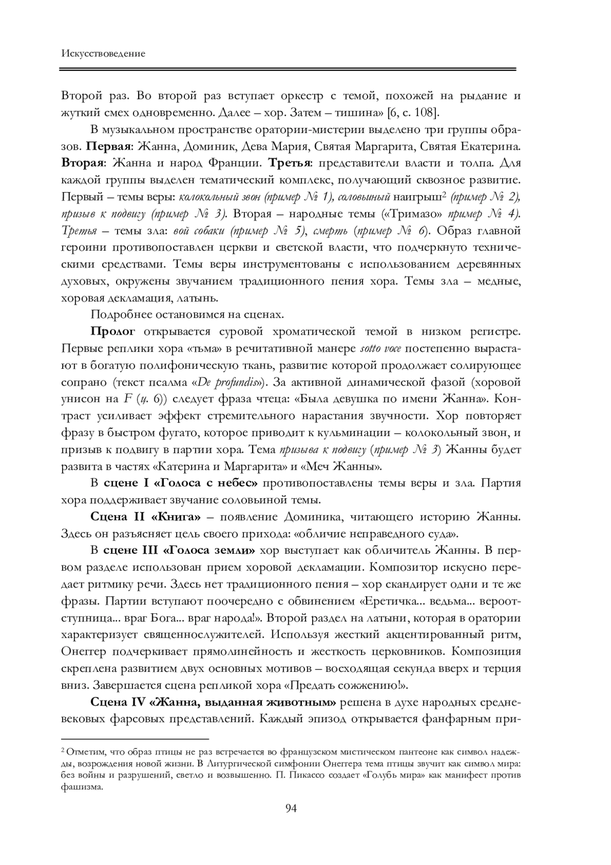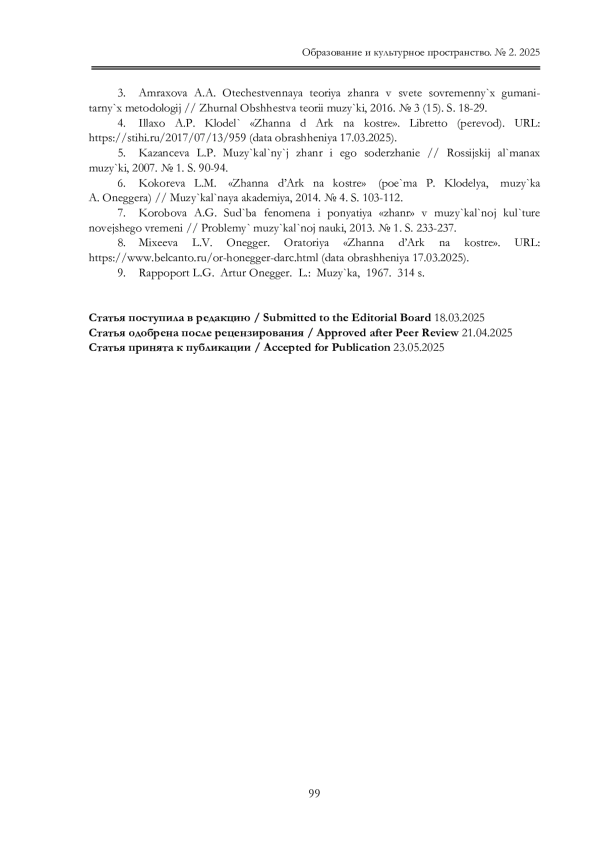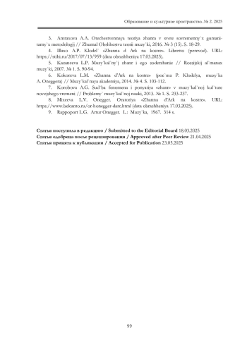 1. Азарова В.В. “Неумирающие элементы архаики” в драматической оратории А. Онеггера “Жанна д’Арк на костре” // Человек и культура, 2020. № 1. С. 35-61. EDN: AMWNZY