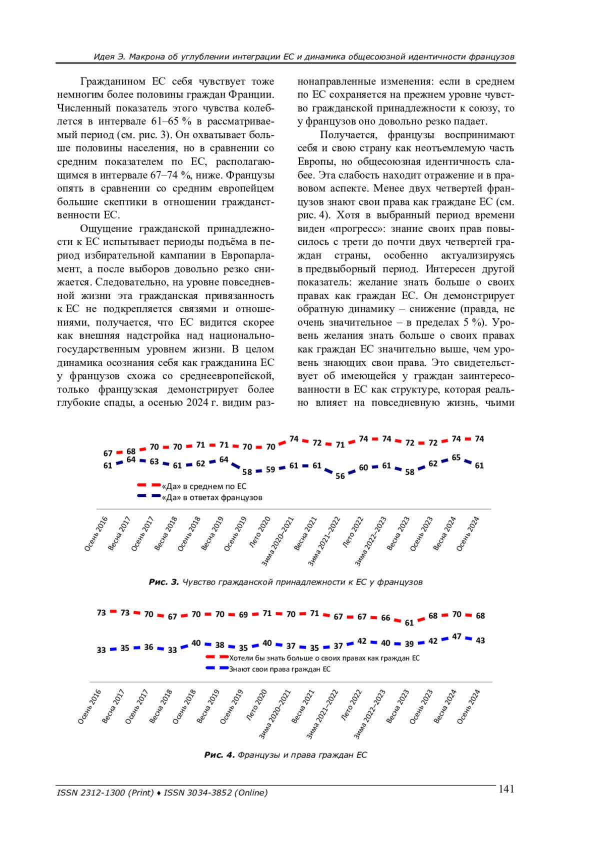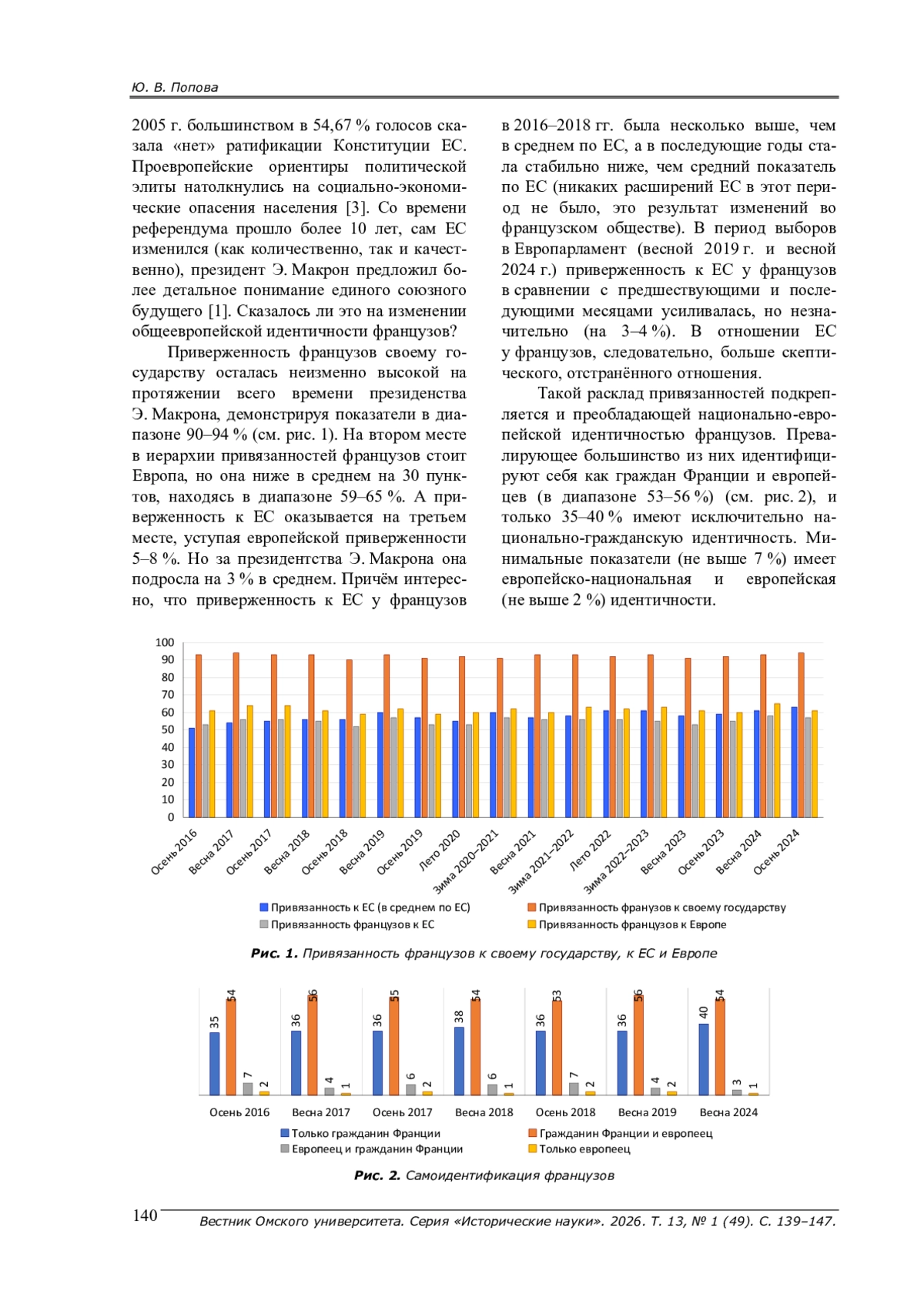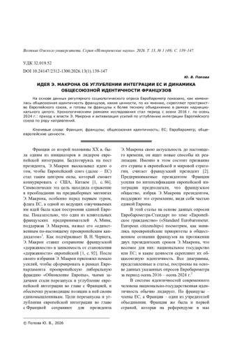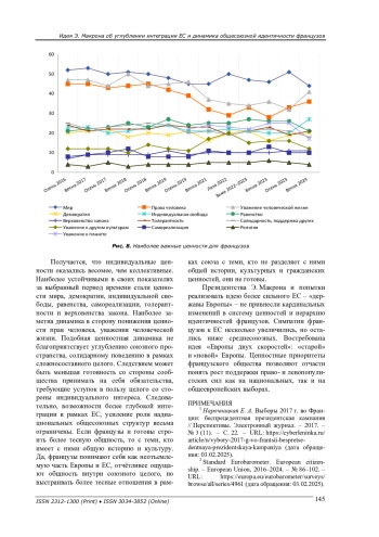 На основе данных регулярного социологического опроса Евробарометр показано, как изменилась общесоюзная идентичность французов, какие ценности, по их мнению, скрепляют пространство Европейского союза, и готовы ли французы к более тесному объединению в рамках наднационального целого. Хронологическими рамками исследования стал период с осени 2016 г. по осень 2024 г.: приход к власти Э. Макрона и активизация усилий по углублению интеграции Европейского союза по ряду направлений.