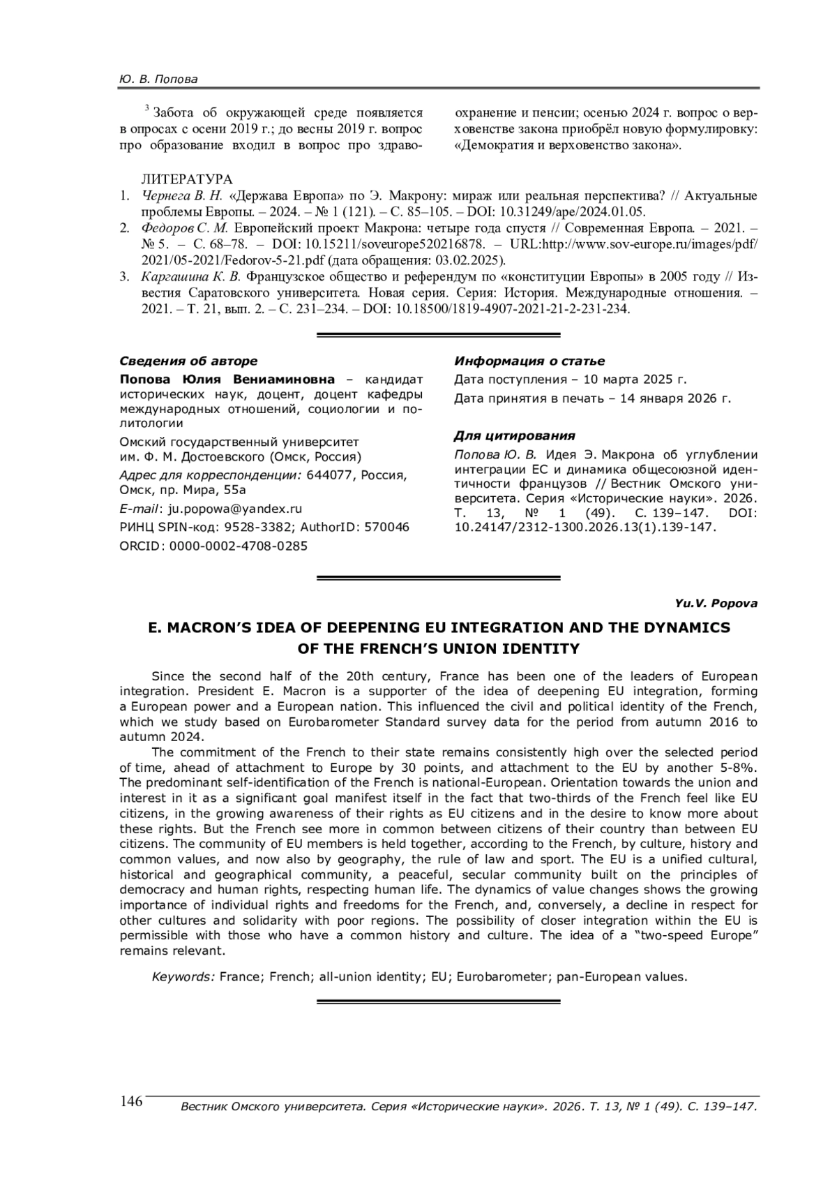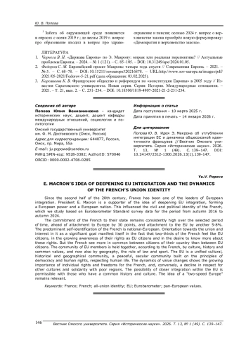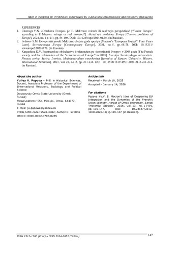 1. Чернега В. Н. “Держава Европа” по Э. Макрону: мираж или реальная перспектива? // Актуальные проблемы Европы. - 2024. - № 1 (121). - С. 85-105. -. DOI: 10.31249/ape/2024.01.05