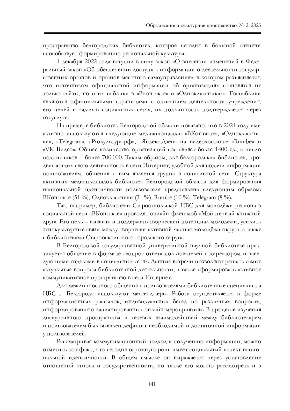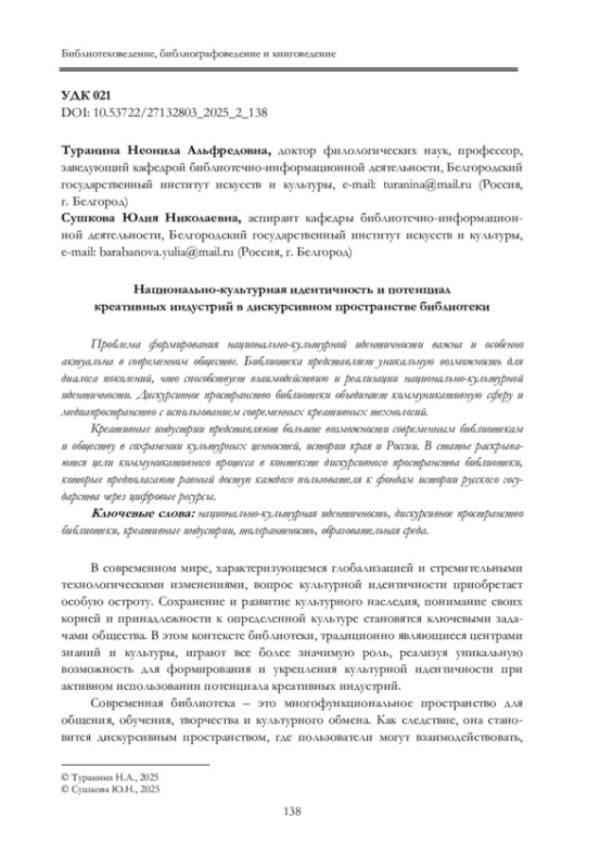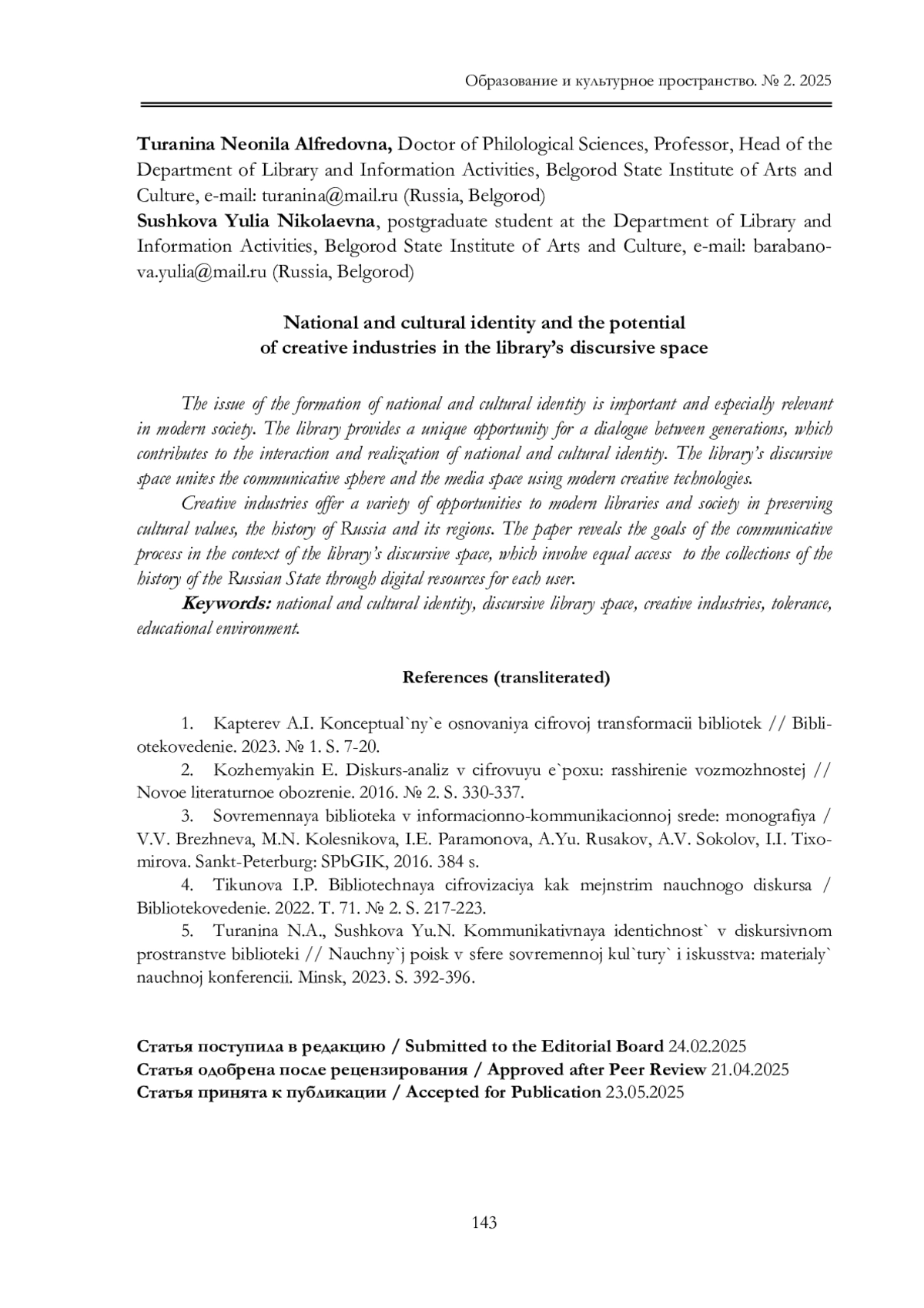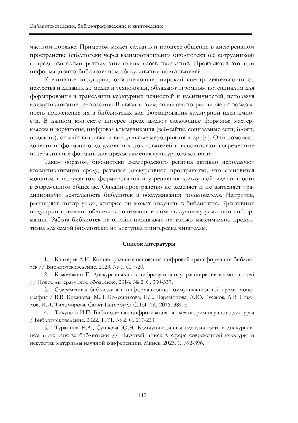 5. Туранина Н.А., Сушкова Ю.Н. Коммуникативная идентичность в дискурсивном пространстве библиотеки // Научный поиск в сфере современной культуры и искусства: материалы научной конференции. Минск, 2023. С. 392-396. EDN: QSFPRF