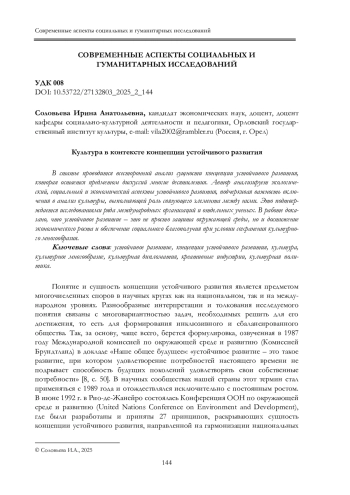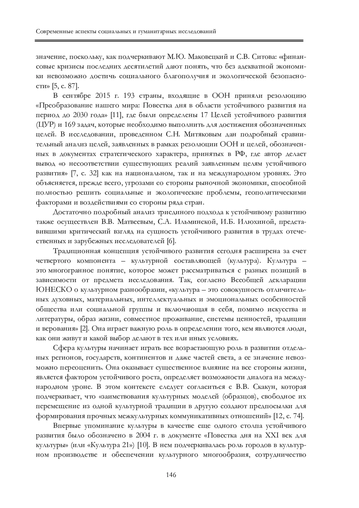 В статье проводится всесторонний анализ сущности концепции устойчивого развития, которая остается предметом дискуссий многие десятилетия. Автор анализирует экологический, социальный и экономический аспекты устойчивого развития, подчеркивая важность включения в анализ культуры, выполняющей роль связующего элемента между ними. Это подтверждается исследованиями ряда международных организаций и отдельных ученых. В работе доказано, что устойчивое развитие - это не просто защита окружающей среды, но и достижение экономического роста и обеспечение социального благополучия при условии сохранения культурного многообразия.