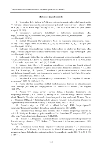 1. Востряков Л.Е., Волков В.А. Консервативное измерение вектора культурной политики // Культура и образование: научно-информационный журнал вузов культуры и искусств. 2023. № 3 (50). С. 15-22. URL: 10.2441/2310-1679-2023-350-15-22 (дата обращения 01.11.2024). DOI: 10.2441/2310-1679-2023-350-15-22( EDN: CPROYC