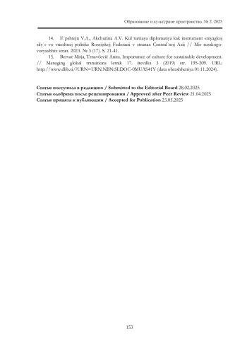 14. Эпштейн В.А., Акчурина А.В. Культурная дипломатия как инструмент “мягкой силы” во внешней политике Российской Федерации в странах Центральной Азии // Мир русскоговорящих стран. 2023. № 3 (17). С. 21-41. EDN: SDZLJP