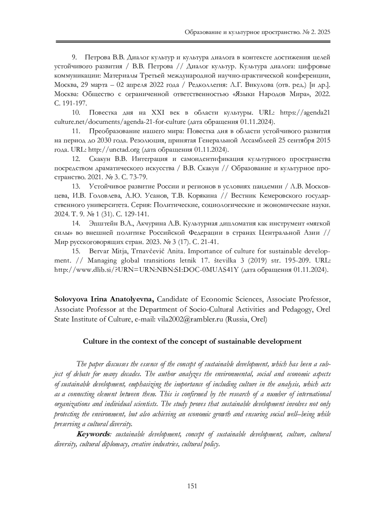 8. Наше общее будущее: Доклад Международной комиссии по окружающей среде и развитию (МКОСР): пер. с англ.; под ред. С.А. Евтеева и Р.А. Перелета / М.: Прогресс, 1989, 372 c. Образование и культурное пространство. № 2. 2025.