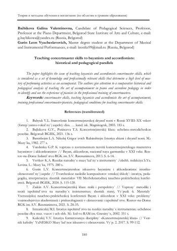 6. Гурин Л.В. Концертмейстерское искусство баяниста и аккордеониста: историкообразовательный аспект // Творческое наследие композиторов венской школы: история, педагогика, интерпретация: сборник материалов VII Международной научнопрактической конференции. Белгород: БГИИК, 2024. С. 115-120. EDN: IOACDQ