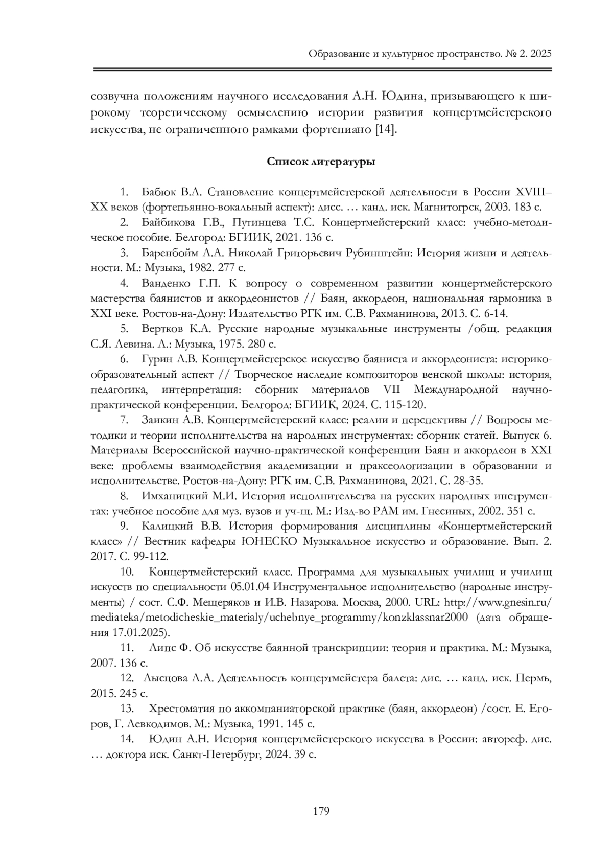 14. Юдин А.Н. История концертмейстерского искусства в России: автореф. дис. … доктора иск. Санкт-Петербург, 2024. 39 с.