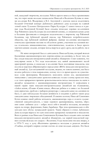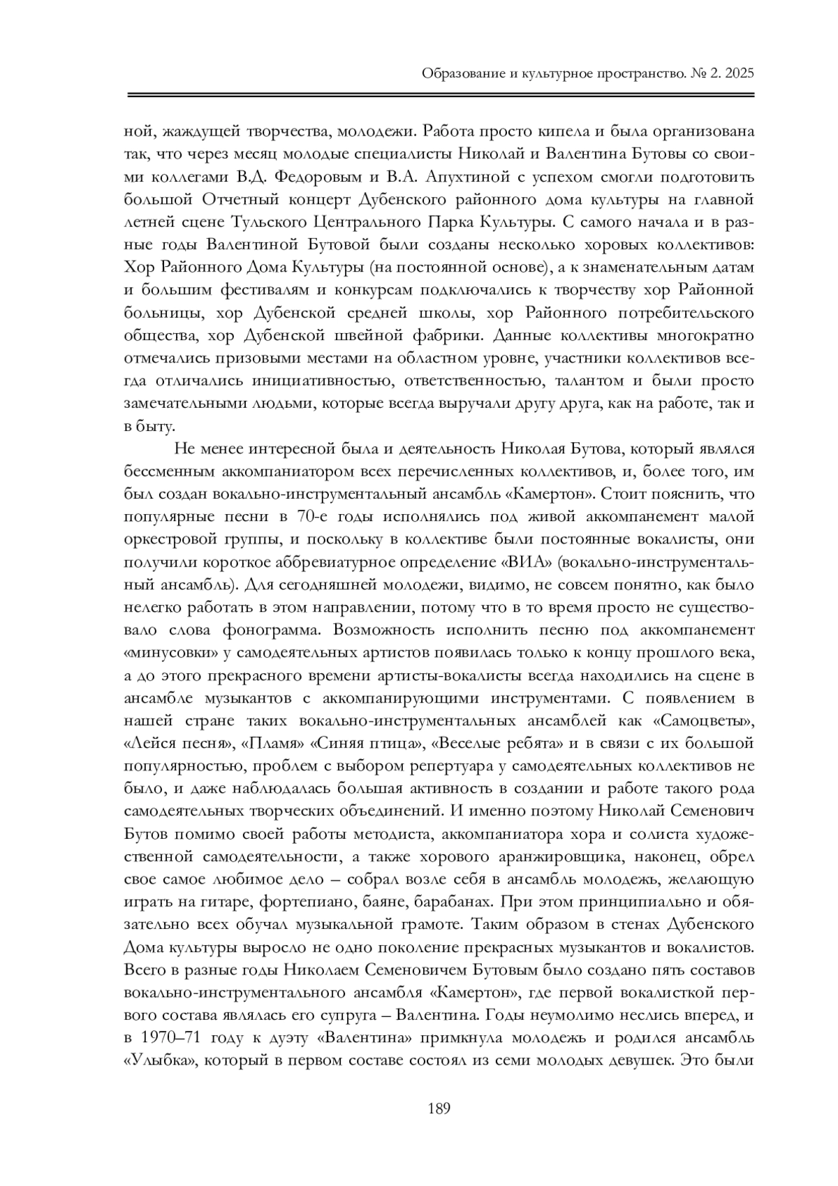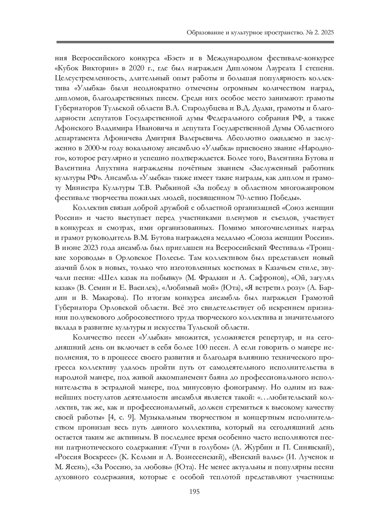 В статье рассматривается история создания и длительной плодотворной деятельности народного вокального ансамбля «Улыбка» Тульской области (посёлок Дубна) под бессменным руководством Заслуженного работника культуры России Валентины Макаровны Бутовой. В содержании подчёркиваются особенности столь феноменально долговременного творческого пути любительского коллектива, обозначена репертуарная составляющая, проанализирована необходимость произошедшей трансформации манеры исполнения.