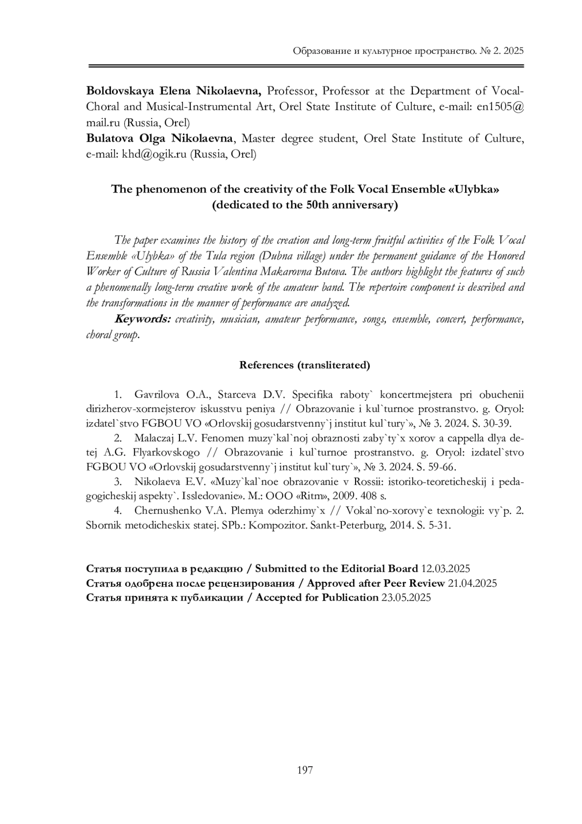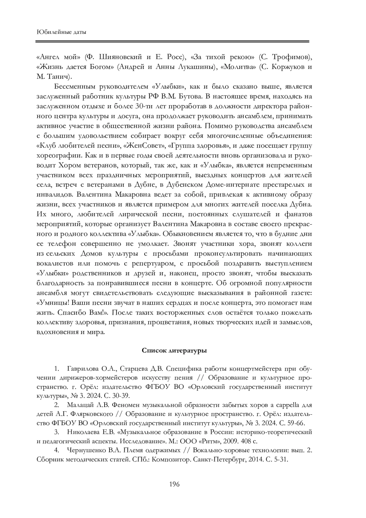 1. Гаврилова О.А., Старцева Д.В. Специфика работы концертмейстера при обучении дирижеров-хормейстеров искусству пения // Образование и культурное пространство. г. Орёл: издательство ФГБОУ ВО “Орловский государственный институт культуры”, № 3. 2024. С. 30-39.