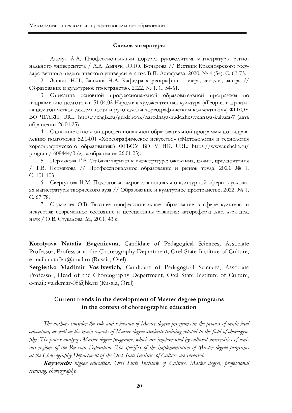 2. Заикин Н.И., Заикина Н.А. Кафедра хореографии - вчера, сегодня, завтра // Образование и культурное пространство. 2022. № 1. С. 54-61. EDN: NAMBOT
